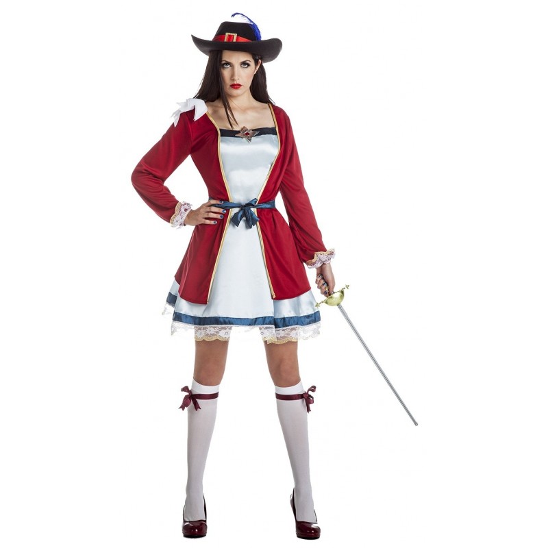 Disfraz de Lady Mosquetera o Espadachina para mujer. Incluye chaqueta, vestido con enagua y cinturón. No incluye sombrero, espada, medias ni calzado.