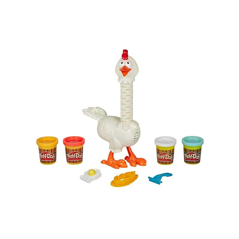 ¡Conoce a Plumas Divertidas! Un juego que permitirá a los niños hacer crecer plumas, cortarlas, poner huevos Play-Doh y hacer divertidos sonidos de gallina.