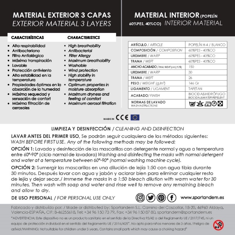El material exterior está compuesto de 3 capas que tienen una eficacia de filtración bacteriana del 99,80 % y de presión diferencial (respirabilidad) del 42,00 Pa/cm2. NORMA_EN 14683: 2019 + AC: 2019, CERTIFICADO POR EUROFINS/ENSAYO Nº: AR_20_YL_003678_02_EN.