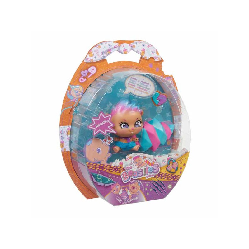 ¡Los Roasty son la raza más peligrosa! Vas a tener que tener mucho cuidado con ellos porque son una raza rompecorazones. Su travesura favorita es….¡rugir! Y si pueden dar un susto a alguien mucho mejor. Cada Beastie viene con su accesorio, pañal y su Beastiepedia.
