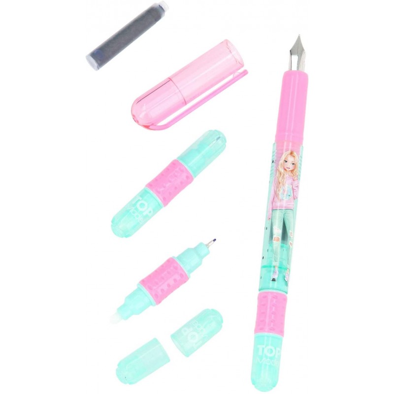 Consta de una pluma, tres borradores de tinta Duo extraíbles y 2 cartuchos de tinta azul estándar