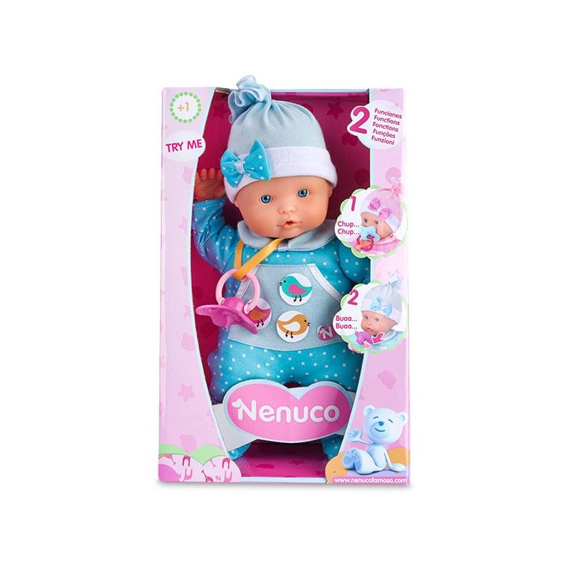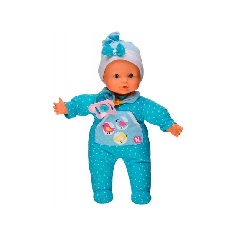 Muñeco Llorón blandito con vestido de color azul decorado con pájaros y con gorrito. Si le das el chupete hará sonidos de chuparlo, pero si se lo quitas se pondrá a llorar. Además, puede meterse el dedo en la boca como los bebés de verdad. Edad recomendada: +12 meses.