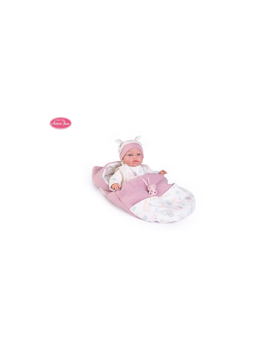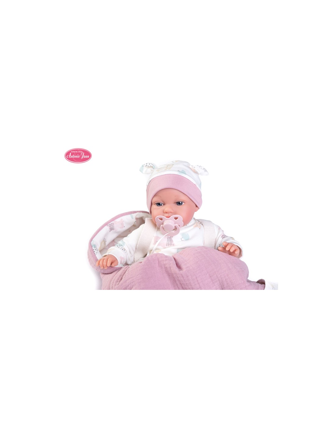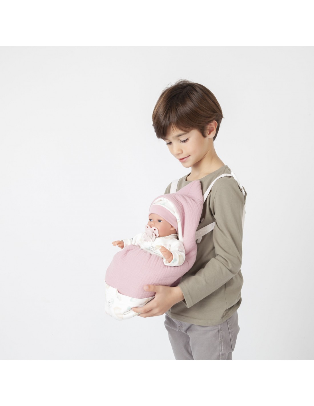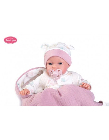 Blandito y de tacto especial, con cuerpo de tela y extremidades de suave vinilo, es un pequeño bebé fácil de manejar en el juego. Si le aprietas su barriguita balbucea para que disfrutes escuchando sus primeros sonidos y ampliar las posibilidades de juego. Baby Toneta palabritas viene muy preparada con su saco-mochila para que la puedas llevar a pasear allá donde vayas. En su saco tiene unos bolsillos para que guardes algunas de sus cositas, como el chupete. Tiene un gorrito con orejitas a juego de su traje que la hace estar guapísima. No te olvides de ponerle el chupete para que se duerma y se relaje. Mide 33 cm. y pesa 535 gr. Baby Toneta, de Muñecas Antonio Juan está esperando poder jugar contigo y que la lleves a pasear con su mochila.