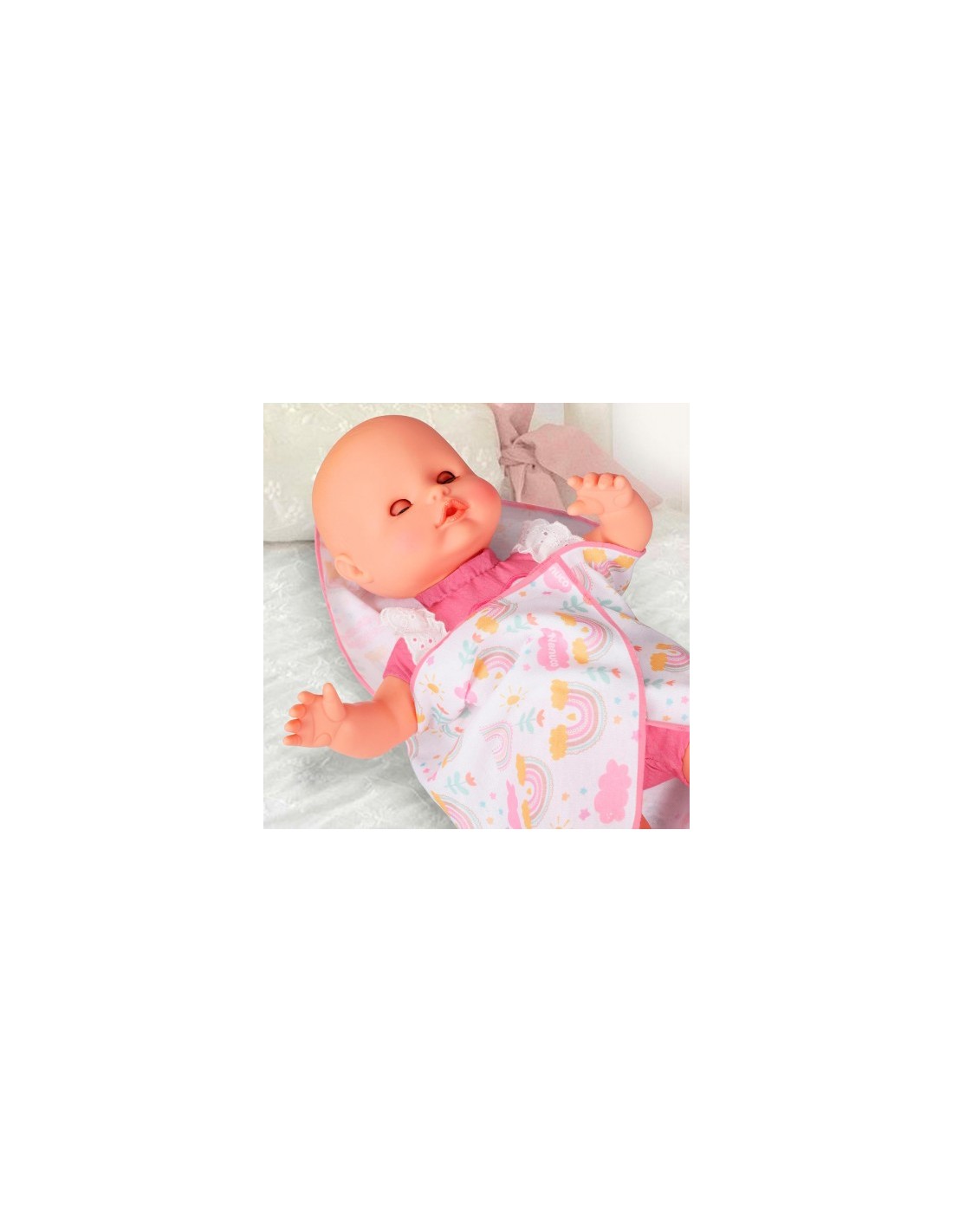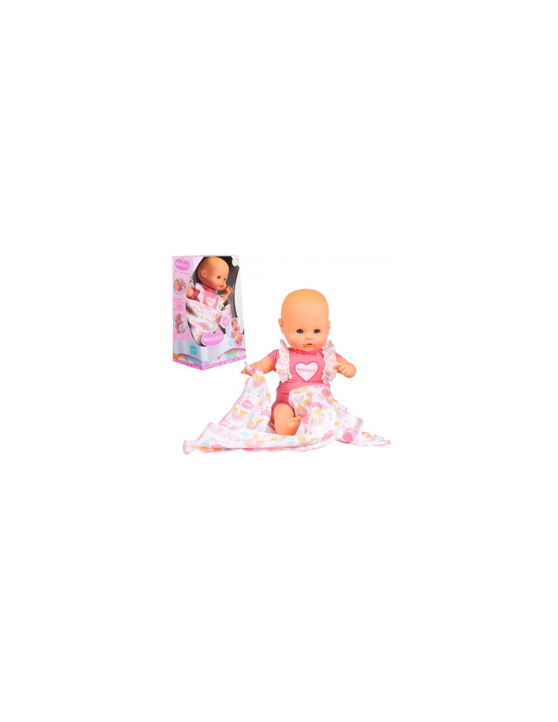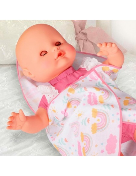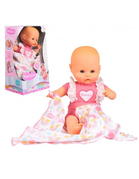 Muñeco Nenuco blandito con ojos durmientes que hace sonidos de bebé al presionar su tripa e incluye una manta para una experiencia realista.