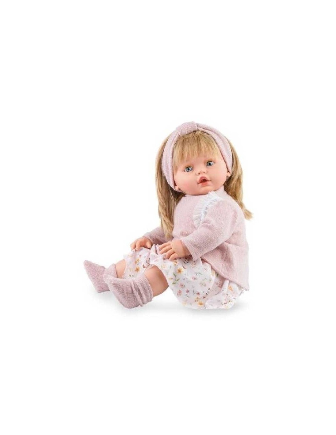 Preciosa muñeca con un diseño muy realista, fabricada en material blandito para el cuerpo y suave vinilo de calidad para la cabeza y las extremidades. Una muñeca con melena rubia muy conseguida, brillantes ojos claros y un precioso conjuntito primaveral.