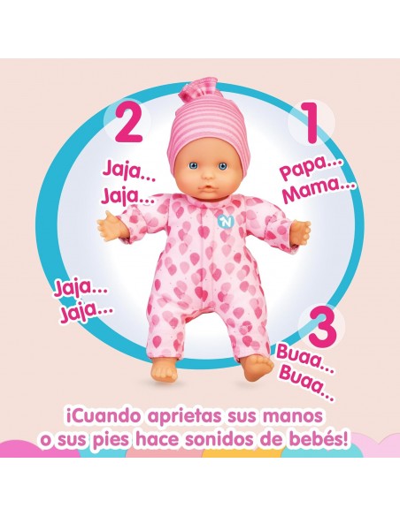 Este adorable muñeco cuenta con tres funciones: al presionar sus manos o pies, emite tiernos sonidos de bebé, agregando realismo y momentos entrañables al juego