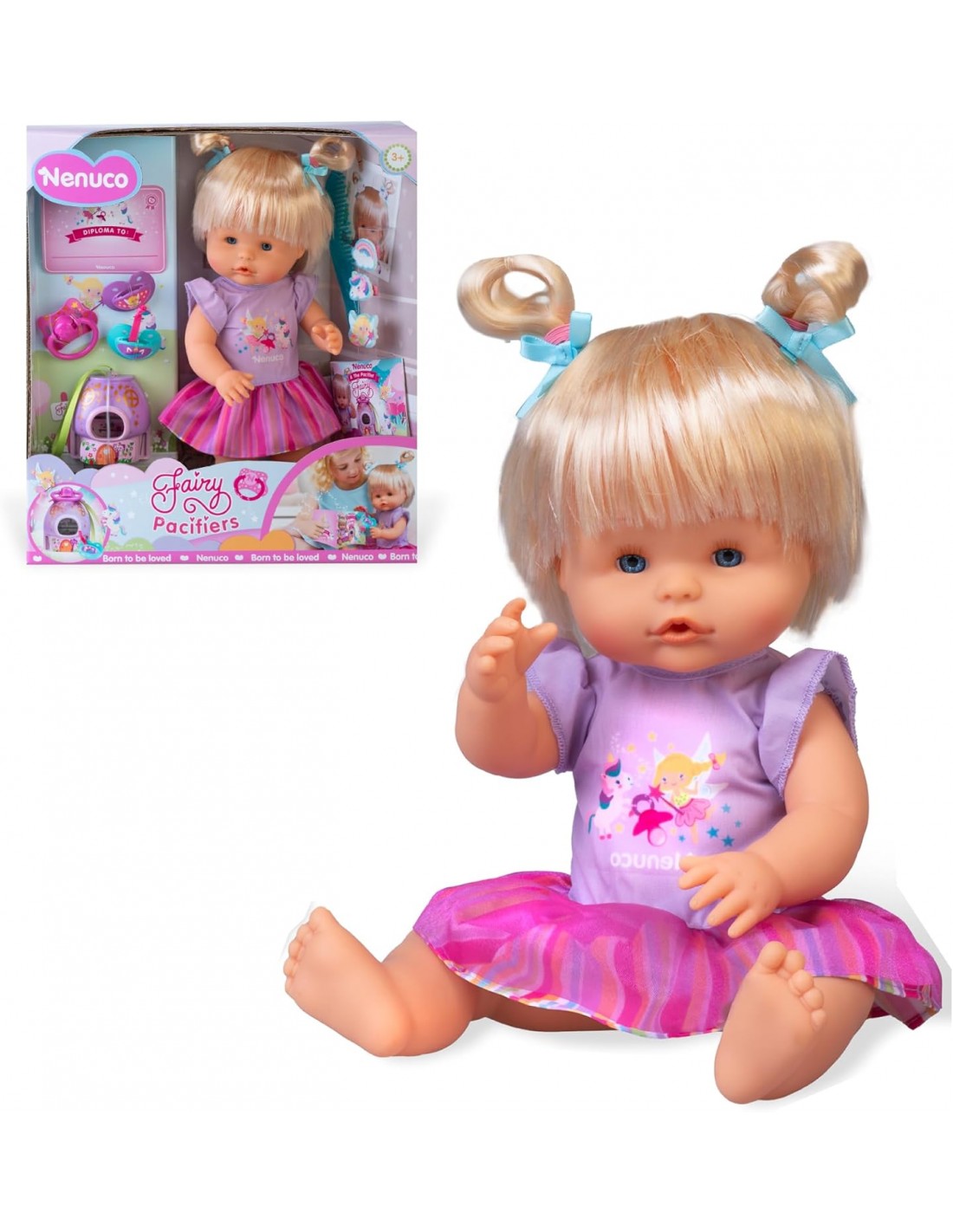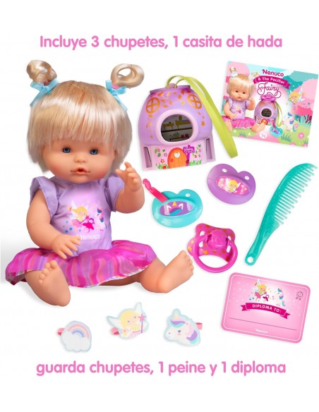 Este Nenuco de 35 cm con pelo rubio y cuerpo duro es perfecto para enseñar a los pequeños a despedirse de sus chupetes de manera divertida y simbólica, gracias a la historia del Hada de los Chupetes