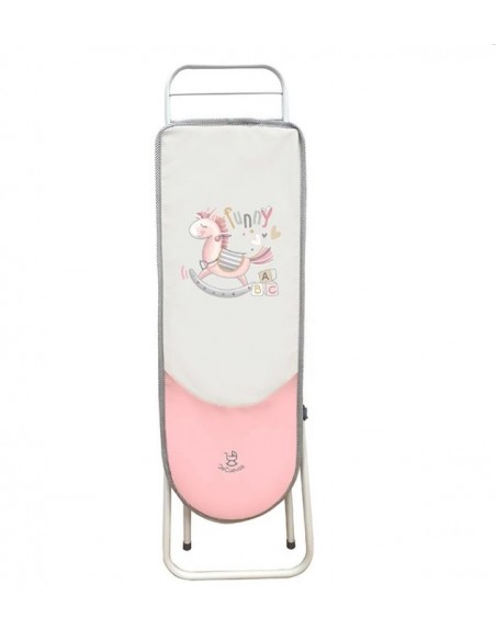 Este planchador plegable es de aluminio de alta calidad, ligero y gran resistencia en color blanco. El tejido superior del centro de planchado es de gran resistencia en color rosa acorde con la línea Funny.