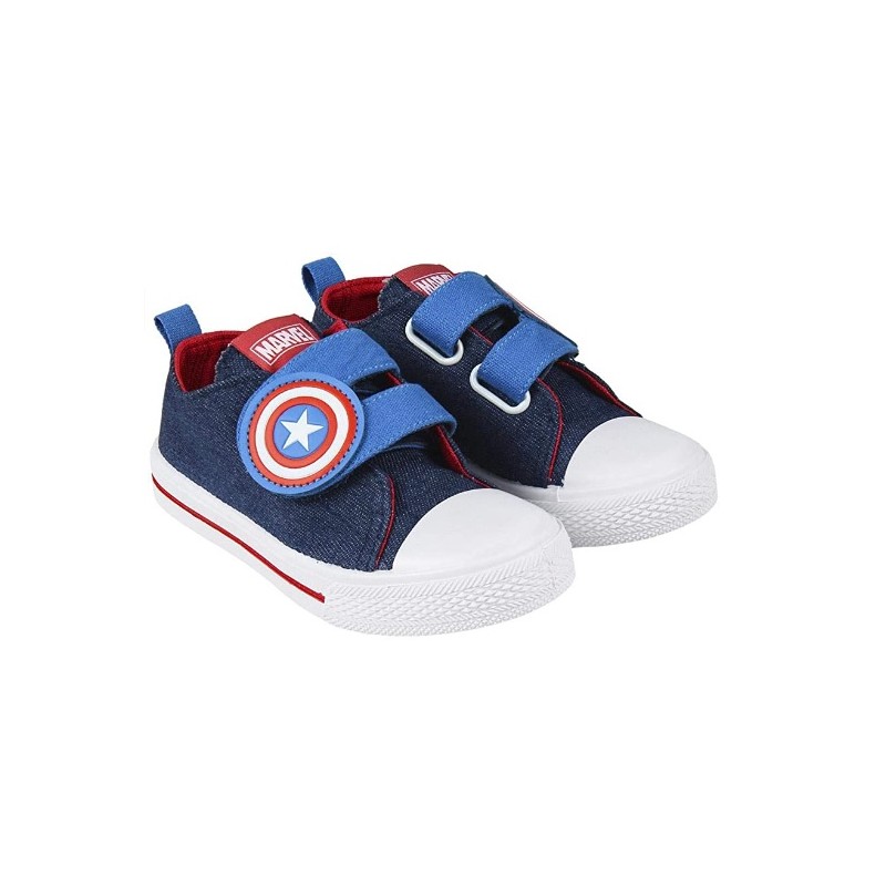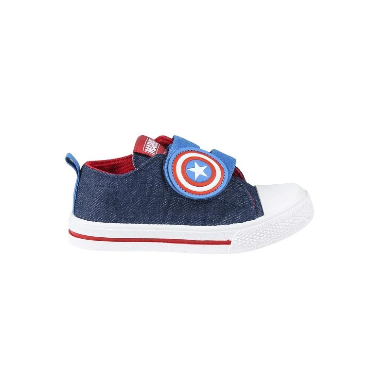 Zapatillas de tela para niños con diseño del capitán américa de color azcon detalle del esculo en la cara exterior de la zapatilla; estas zapatillas para niños están fabricadas con tela y suela de goma antideslizante para asegurar su resistencia y antideslizamiento, tanto en parques como en cualquier aventura en la que se quiera embarcar tu hijo; cuenta con un ciere de velcro para que se pueda poner y quitar las zapatillas él solito; con estas zapatillas del capitán américa se sentirá como su justiciero favorito.