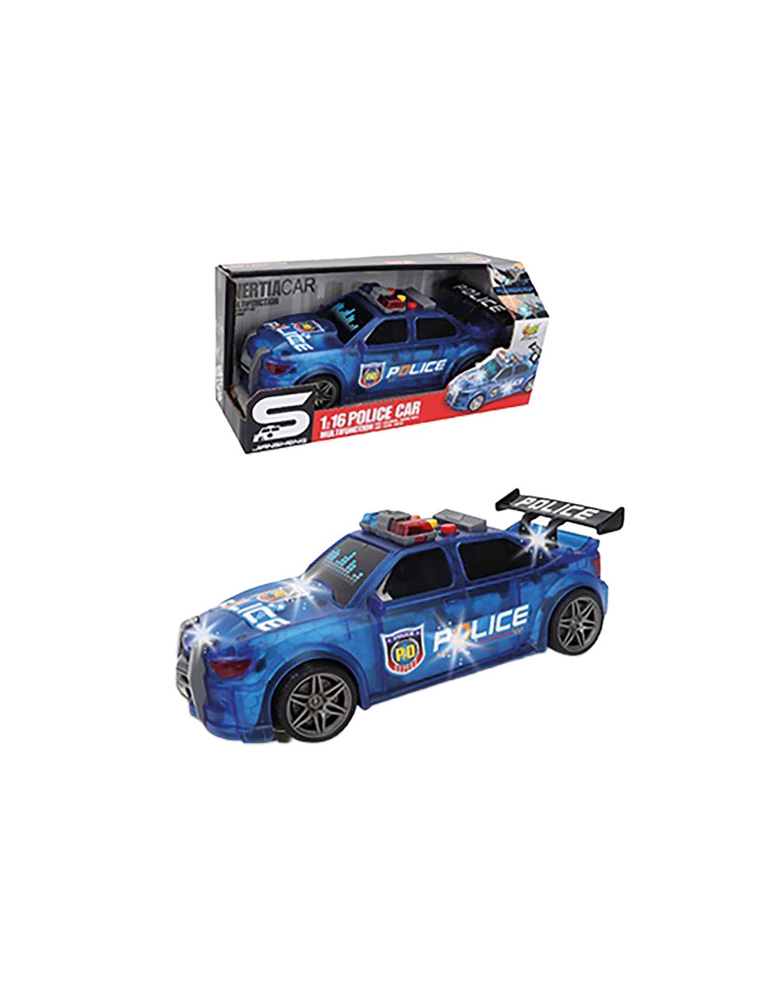 🔵 Diseño de coche de policía deportivo con alerón trasero y gráficos llamativos (escala 1:16).