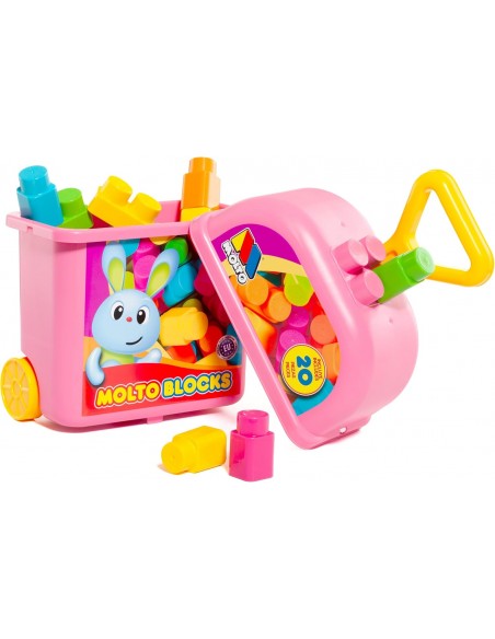 Versatilidad y Facil Almacenamiento: El trolley incluye 20 bloques de preescolar que se pueden guardar y transportar cómodamente, manteniendo el área de juegos ordenada y facilitando su movilidad.