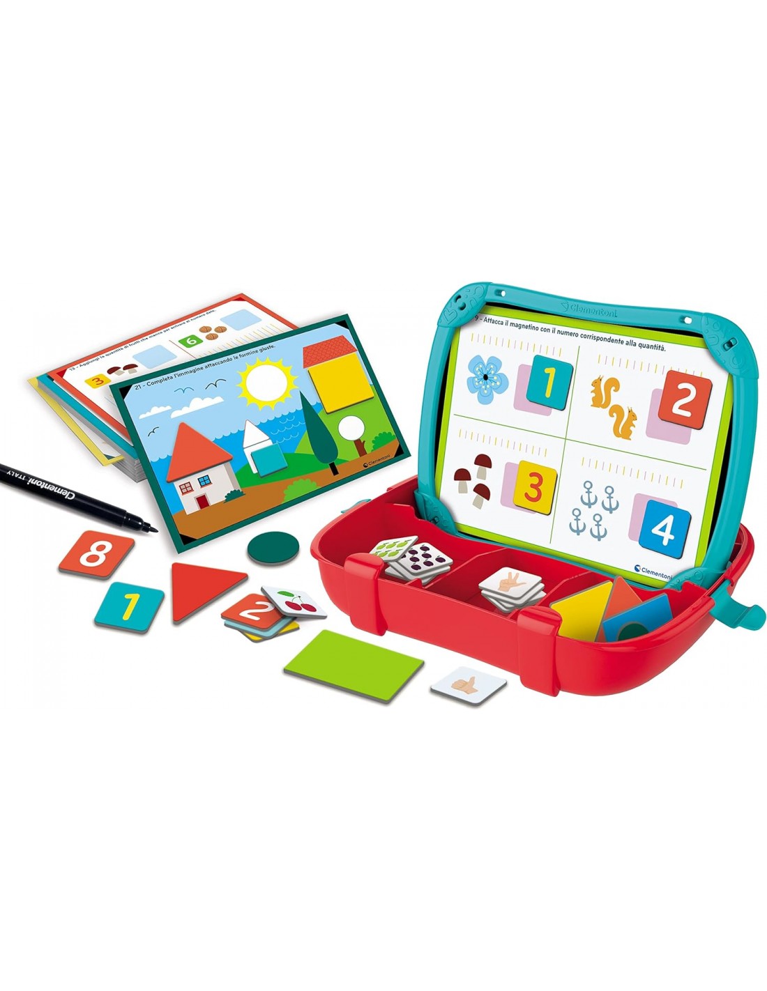 En esta versión, los números y las formas se presentan a través de muchos imanes de colores, que podrás guardar después en el maletín para poderlo llevar siempre contigo