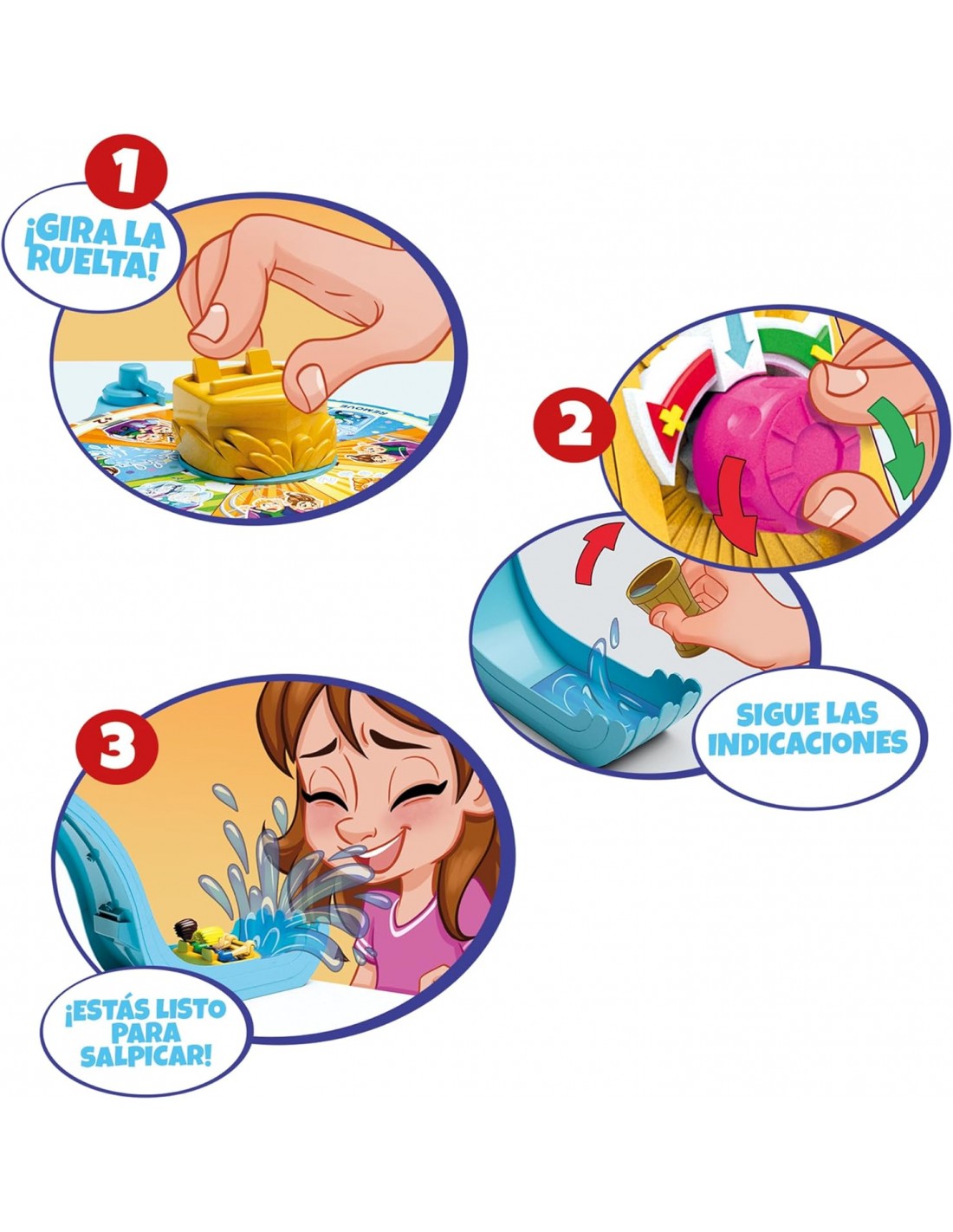 Para comenzar a jugar, cada jugador gira la ruleta y sigue las indicaciones: avanza, retrocede, salta un turno... ¡Todo para evitar caer por la montaña rusa y salpicar! Pero cuidado, ¡el primer jugador que caiga será eliminado!