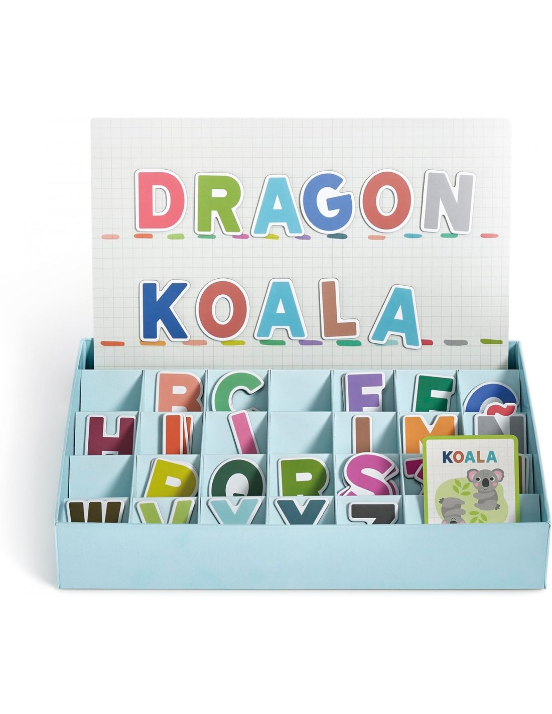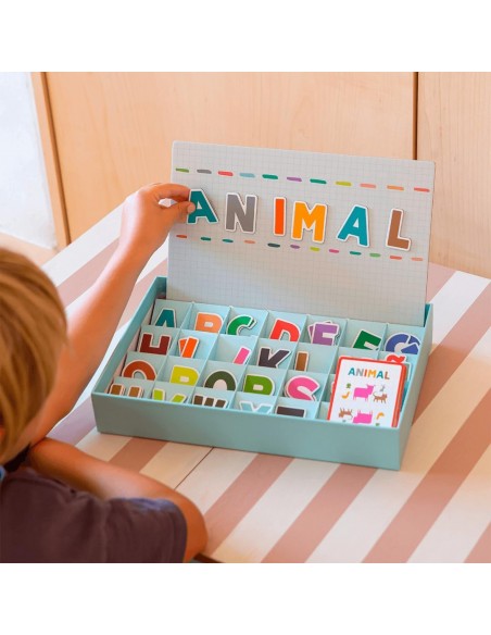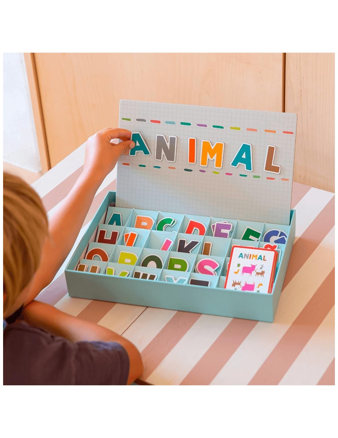 CONTIENE 1 escenario imantado de 28 x 18 cm para encajar en la base de la caja con compartimentos para poder separar las letras del abecedario. Incluye 44 imanes de letras y 15 fichas con ejemplos donde el niño podrá aprender a escribir hasta 30 palabras diferentes en español e inglés con 2 niveles de dificultad
