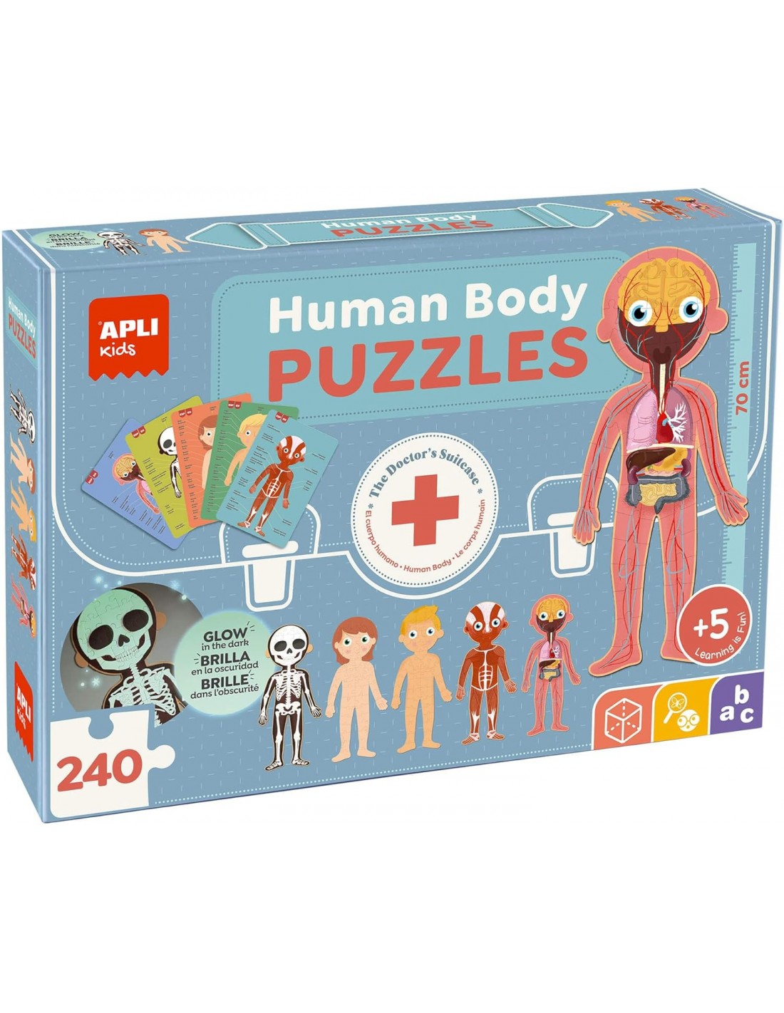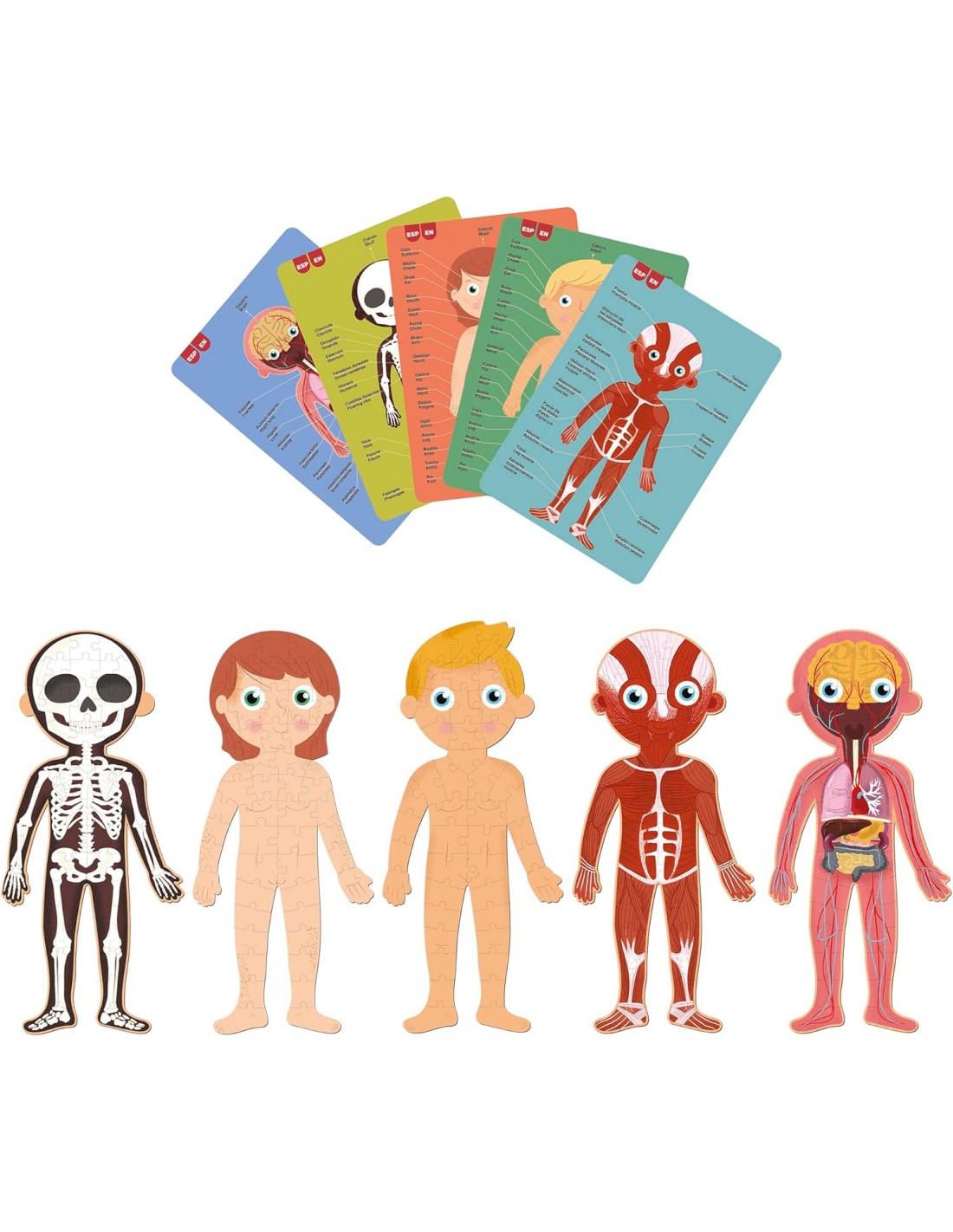 INCLUYE 5 puzles DE 48 PIEZAS cada uno en forma del cuerpo humano, 15 fichas con información detallada en 12 idiomas distintos. Incluye un puzzle fluorescente.