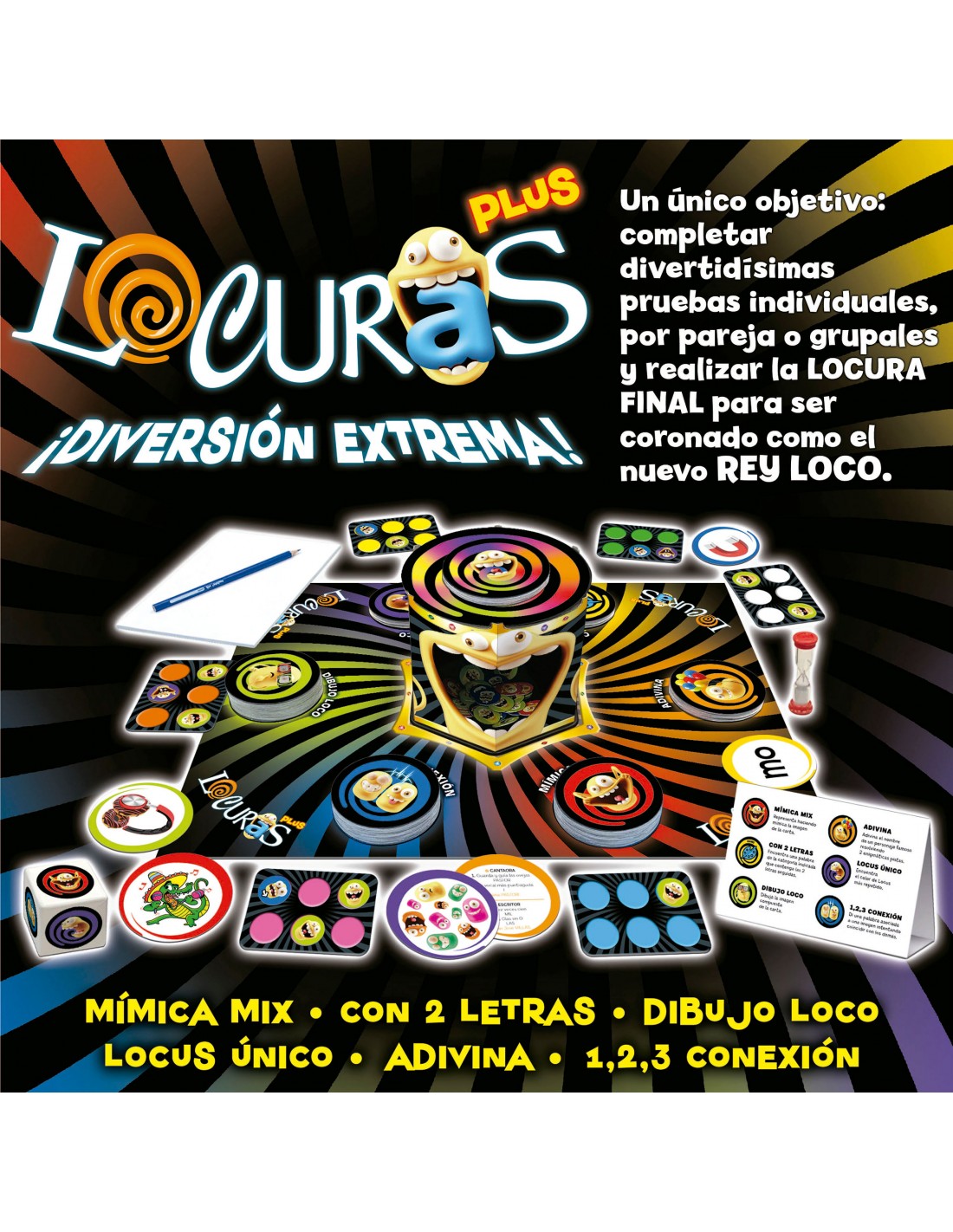 Locuras es un divertidísimo juego de mesa que combina diferentes tipos de pruebas con un punto de locura: pruebas de dibujo, auditivas, de empatía con el resto de jugadores, de mímica, acusaciones ridículas… Juego recomendado de 3 a 10 jugadores.