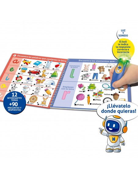 ¡Llévatelo a donde quieras! nuevo CONECTOR APRENDO A LEER en formato libro con boli con luz y sonido. Juego de preguntas y respuestas con el que los niños con los temas más interesantes para aprender a leer Los niños trabajaran los conceptos básicos para aprender a leer como: Pictogramas, primeras letras con la que aprendemos a leer M,S,P T etc. Contenido: 12 láminas con 12 temas en formato libro y mas de 90 preguntas.