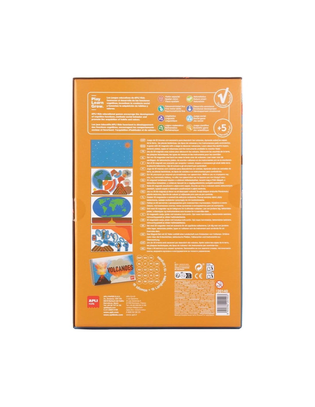 CONTIENE: 1 escenario imantado de 28 x 18 cm para encajar en la base de la caja horizontalmente y 35 fichas magnéticas con ilustraciones educativas, así como un libro encuadernado con explicaciones detalladas en 19 idiomas distintos.