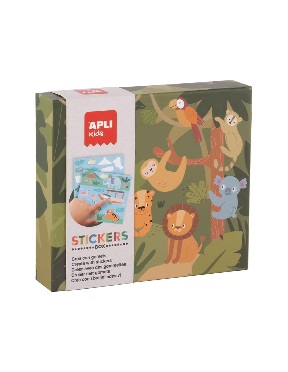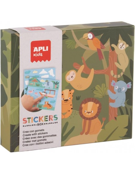 JUEGO de gomets modelo Safari en caja de cartón tipo cajón. El objetivo del juego es completar los dibujos de las fichas usando gomets de distintas colores y estampados relacionando formas y tamaños.