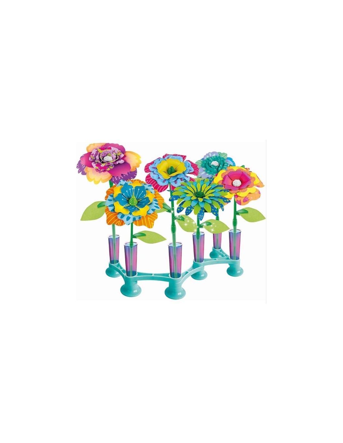 Contenido: 6 floreros transparentes, 6 bases y 6 conectores, 8 tallos con 8 cálices verdes, 12 soportes para moldes de yeso y 8 clavitos de plástico, corolas y pétalos de papel, hojas de goma EVA, molde para yeso, bolsa de yeso, sulfato de calcio, espátula, 1 fragancia perfumada floral, micropipeta, 3 témperas perladas, tampones para difuminar, herramientas con 6 puntas intercambiables, 1 esponja, 2 conos portaflores, siluetas de corolas para calcar y manual ilustrado.