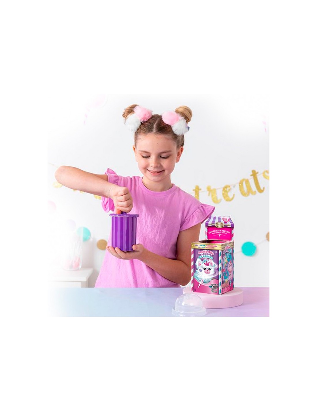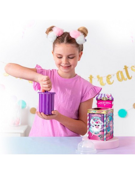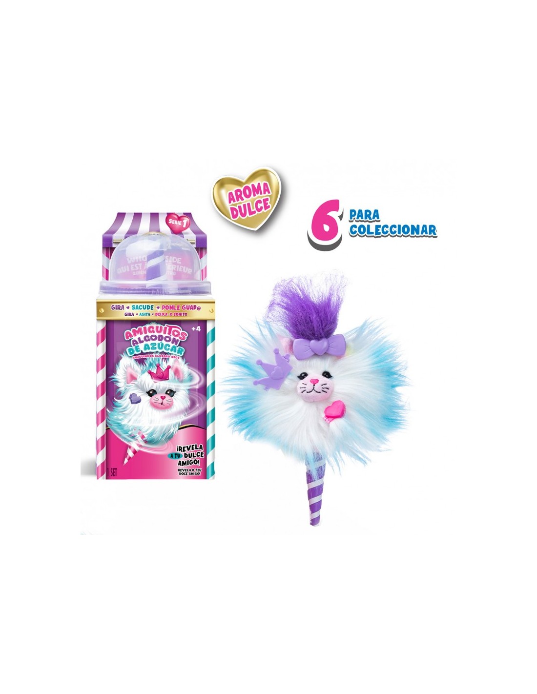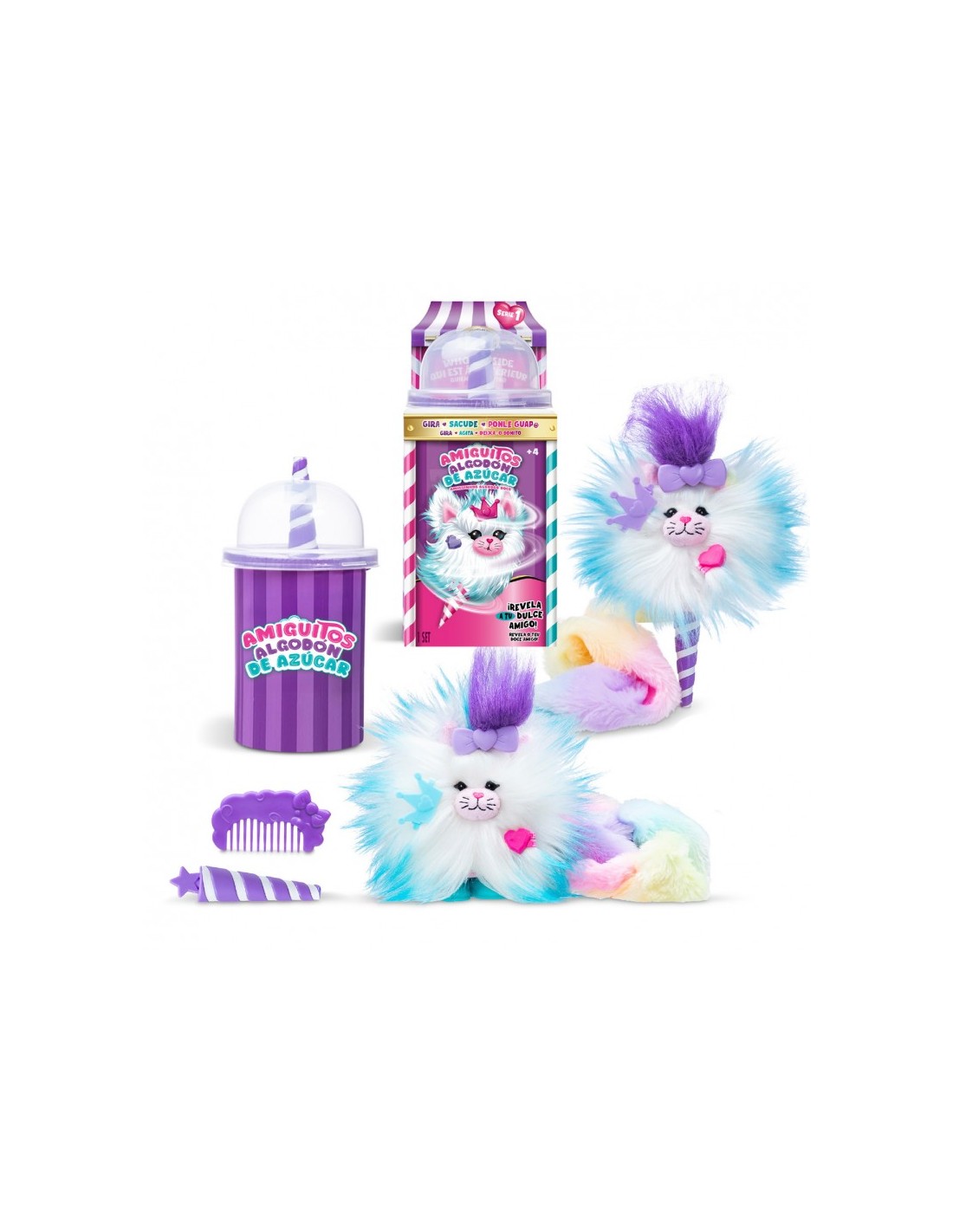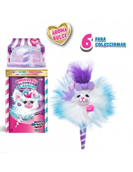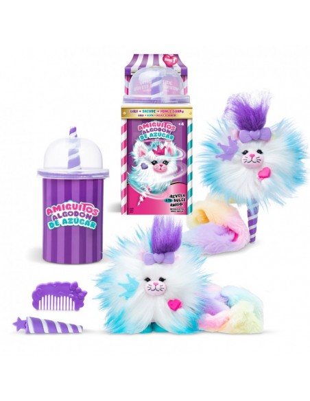 ¿Es algodón de azúcar? ¡Son Amiguitos de Algodón de Azúcar! Disfruta de un divertido proceso dónde girando el cono y agitando, descubrirás un precioso peluche al que peinar, colocar accesorios en su pelazo, ponerle pies para sujetarse en cualquier superficie, y customizarlo a tu gusto. Pero esto no es todo, su cola tiene un divertido diseño Tie-Dye y estirada mide hasta 7 cm. ¡Además, huelen genial! Hay 6 diferentes para coleccionar. Contiene una mascota de algodón, un peine, una extensión para el pelo, 3 accesorios y un par de pies.