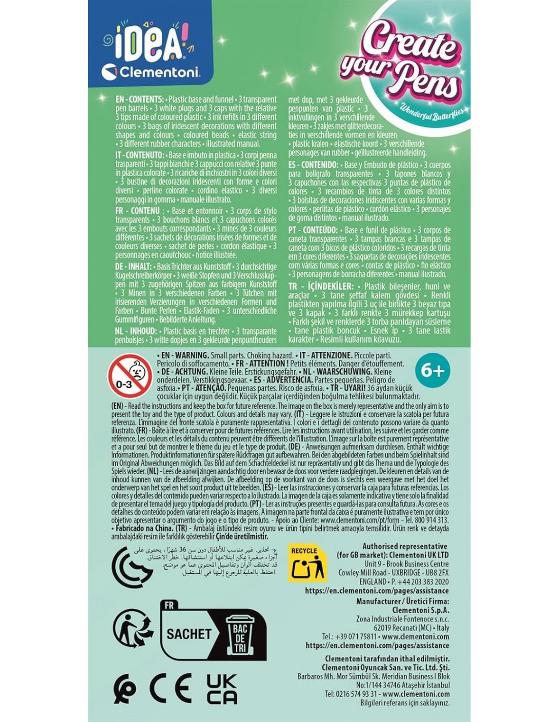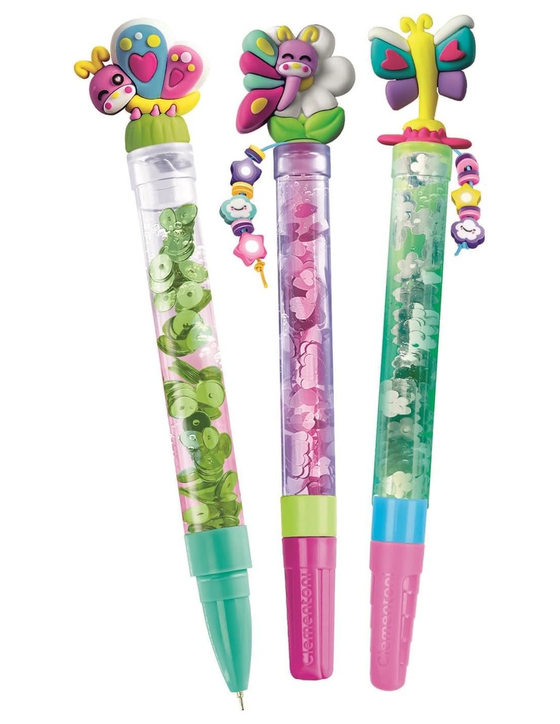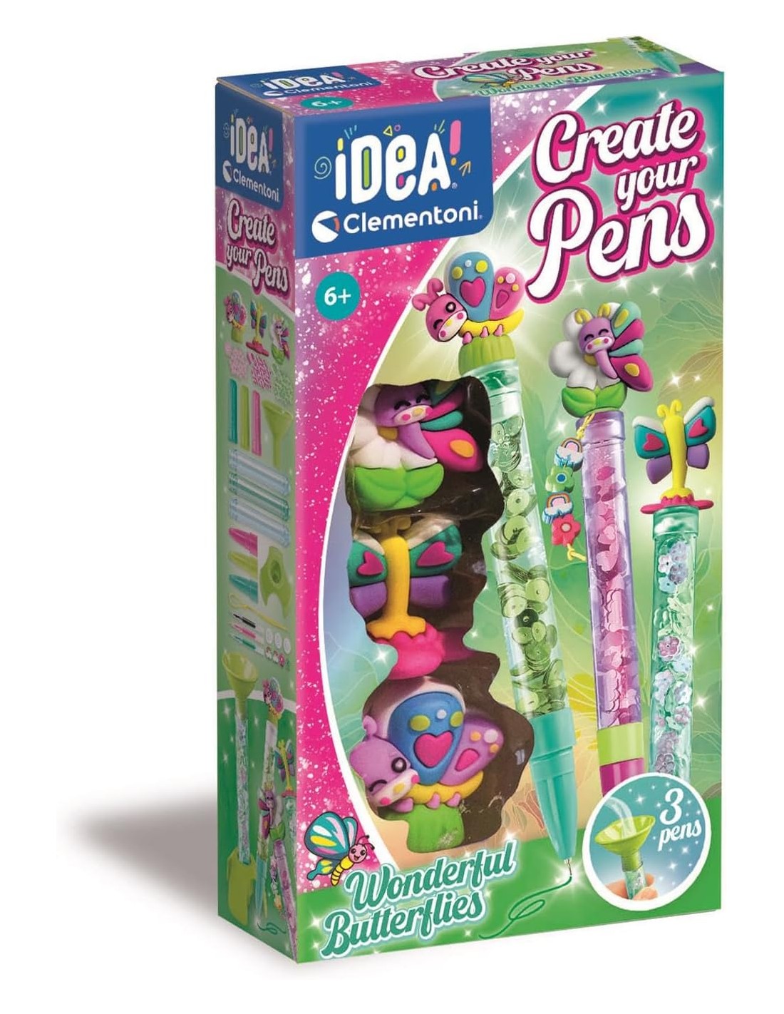 Un original kit creativo con el que montar bolígrafos y personalizarlos con diferentes decoraciones. Un kit práctico y rico que contiene: bolígrafos, tintas de diferentes colores, personajes y todas las herramientas para hacerlos