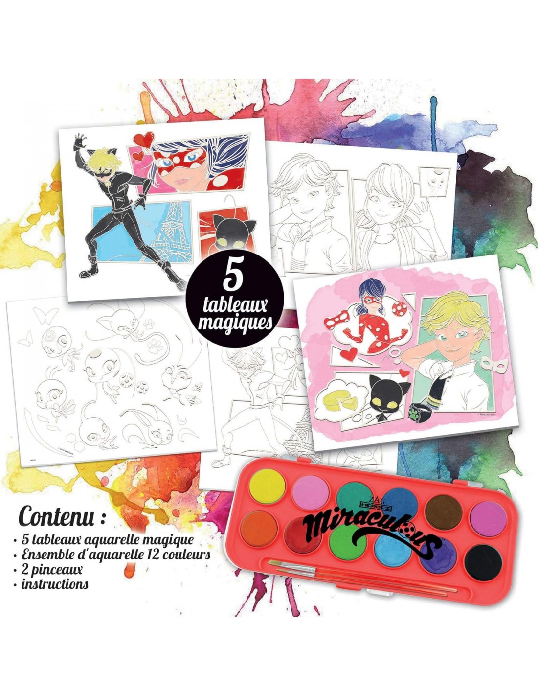 5 cuadros para pintar con acuarela mágicas, 1 caja de acuarela de 12 colores, 1 pincel ancho y plano, 1 pincel fino, instrucciones,