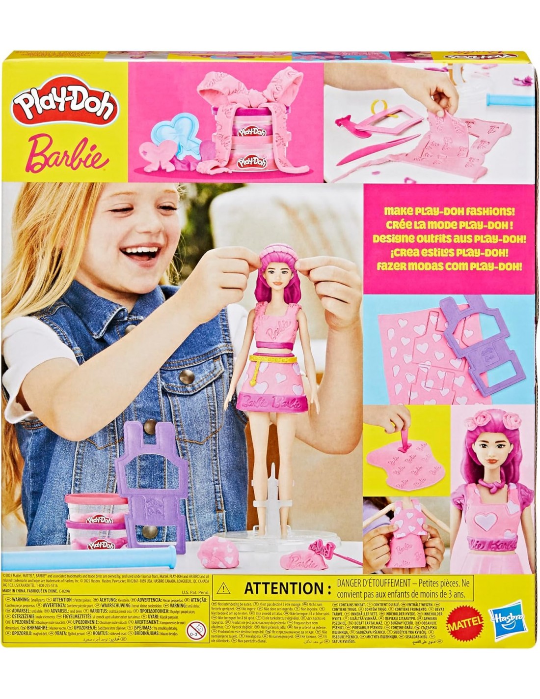 1 HOJA DE PATRONES PLAY-DOH PREFABRICADA: La hoja prefabricada está hecha de 70 gramos de plastilina Play-Doh plana que tiene la apariencia de tela con divertidos diseños que sirven para crear estilos de muñeca (contiene trigo)