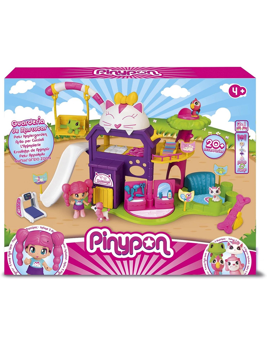El juguete incluye: 4 figuras de mascotas (perro, gato, tortuga y pájaro), una muñeca Pinypon de la cuidadora de animales, el set de la guardería y hasta 20 accesorios