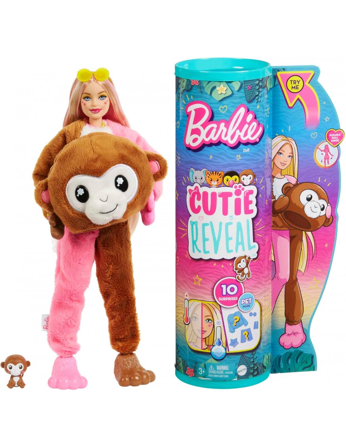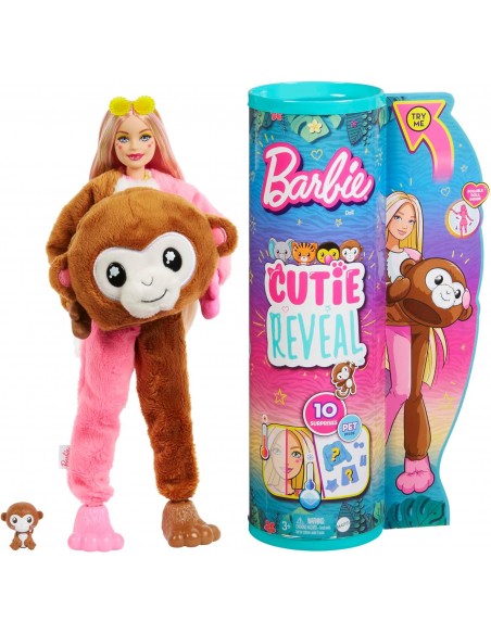 Abre la caja y verás en su interior un descarado mono de peluche que oculta una muñeca Barbie bajo el disfraz. ¿Qué muñeca te tocará?