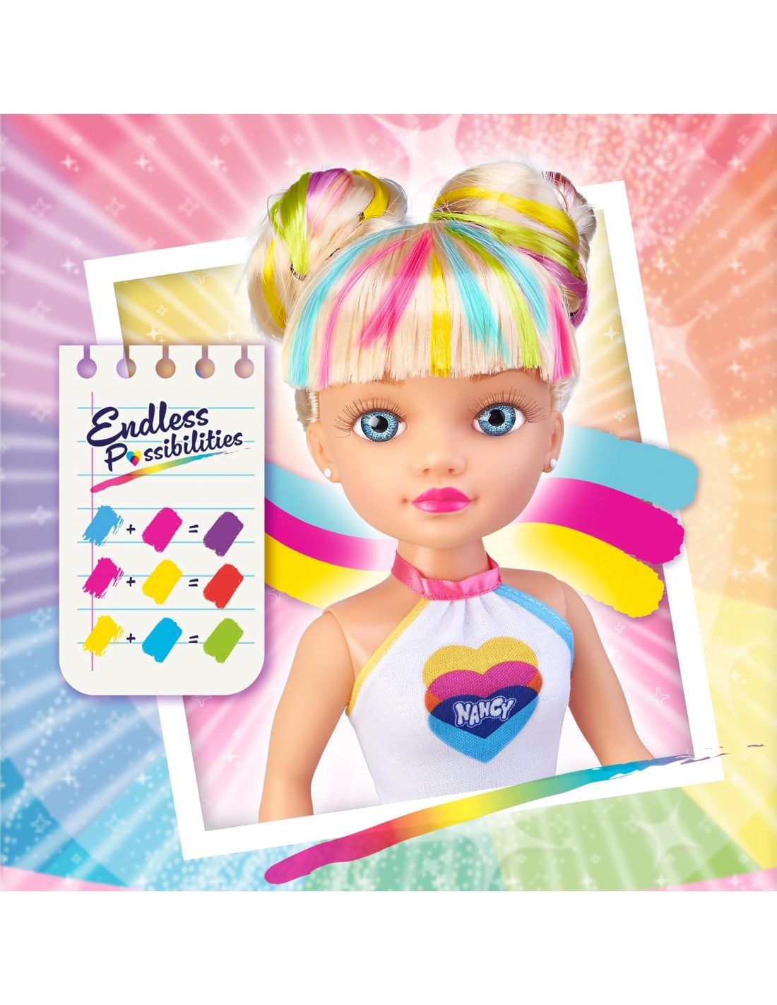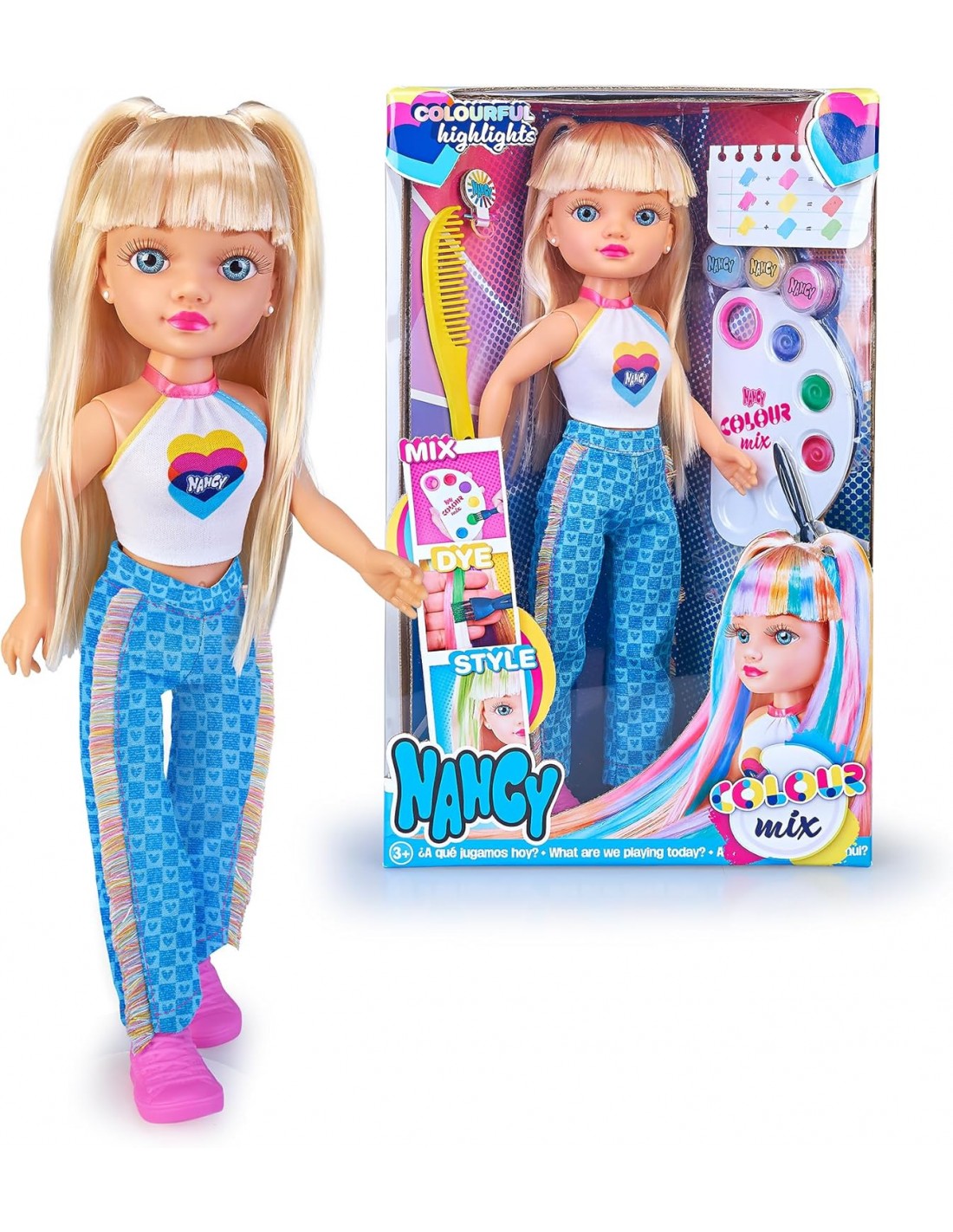 Nancy Colour Mix es el regalo perfecto para pequeños artistas que aman la moda y el diseño; cada sesión de juego es única, con infinitas posibilidades de peinados y colores para explorar; una experiencia llena de imaginación