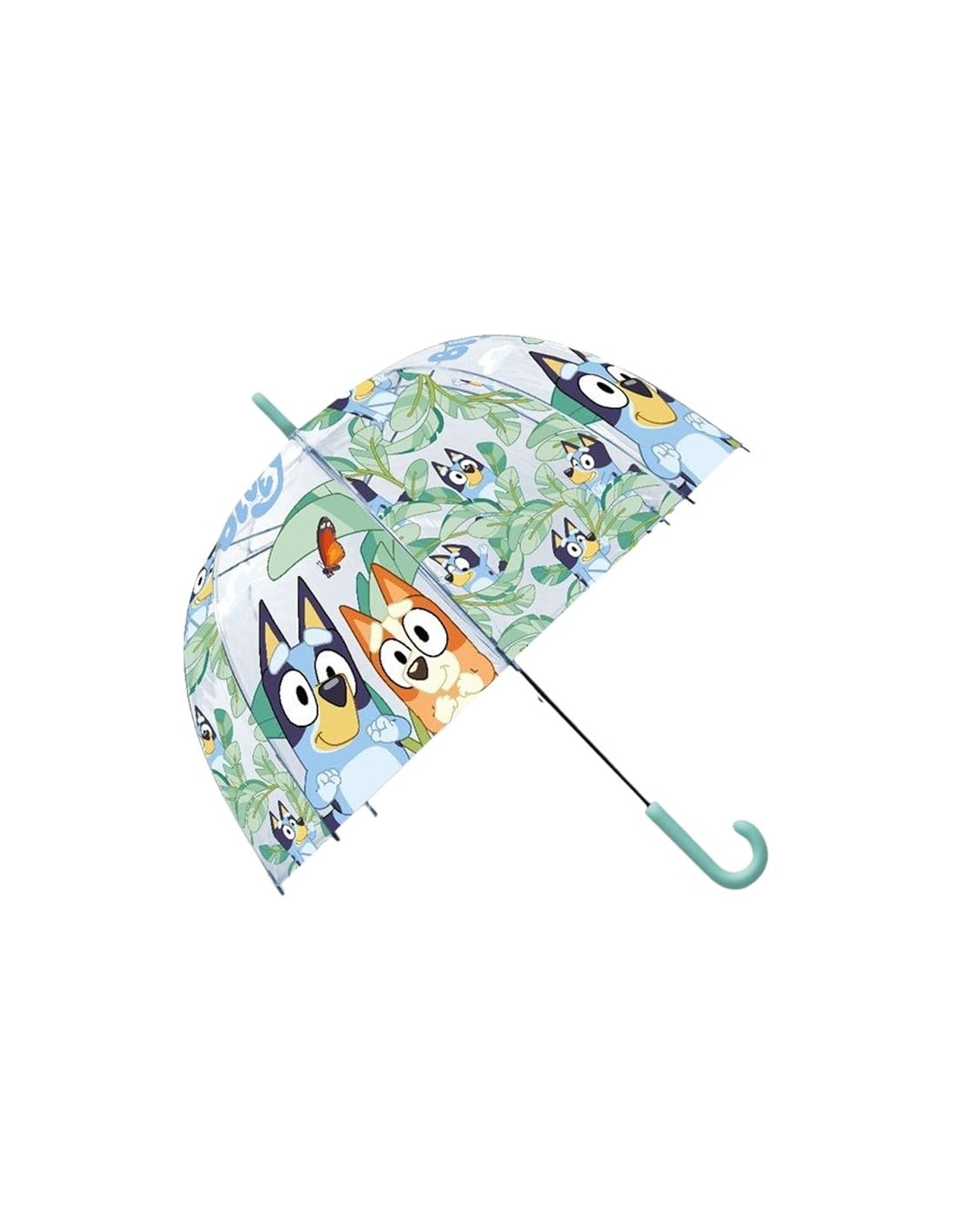 PARAGUAS TRANSPARENTE CON DISEÑO DE BLUEY: ilustrado con los personajes favoritos de la serie para alegrar los días de lluvia.