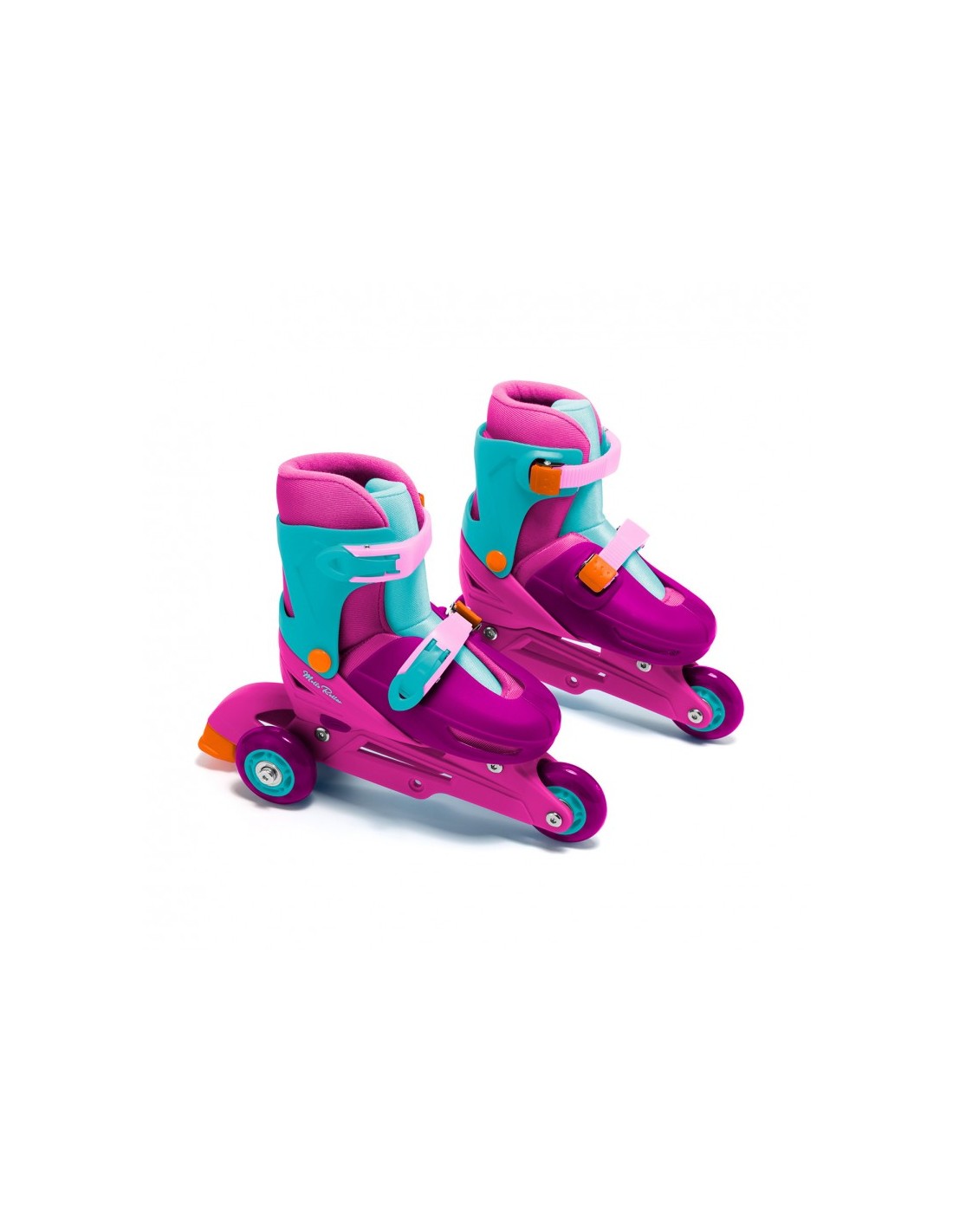 Patines rosas en linea para niños y niñas con dos posiciones, posicion de entrenamiento con dos ruedas detrás en paralelo y una delantera, y posicion experto 3 ruedas en linea. Ajustables talla 31-34, ruedas PVC, acolchado interior, sistema ajustable con hebillas y freno trasero.