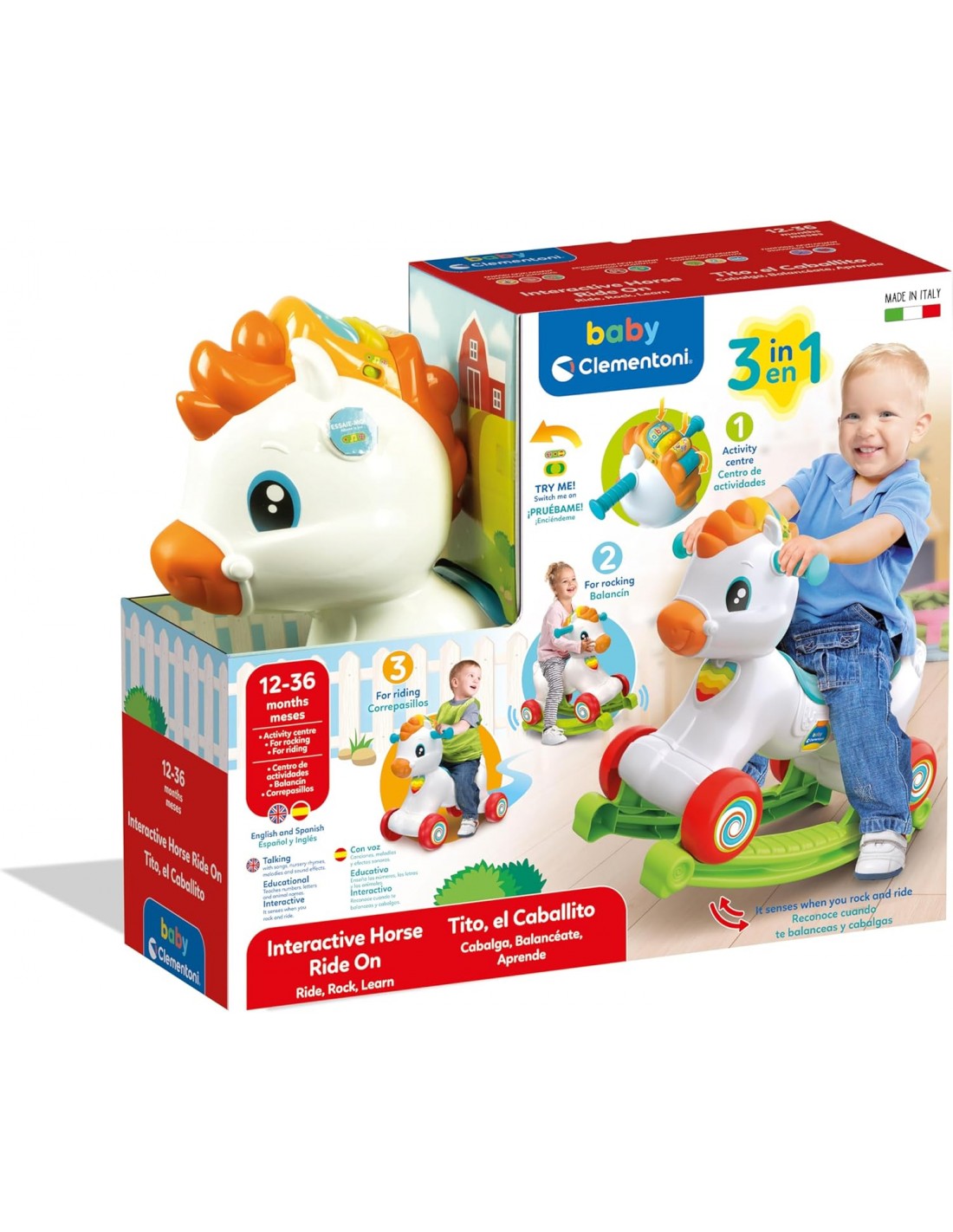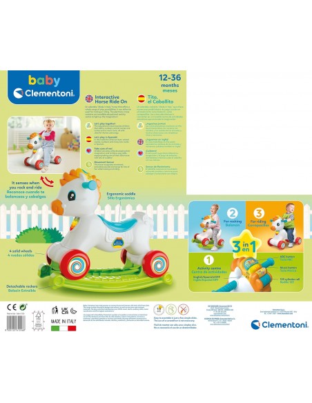 Los botones en la crin y la cabeza del caballito enseñan las letras, los sonidos y los nombres de animales, mientras que los números pueden aprenderse gracias al rodillo giratorio; además, enseña la lengua española