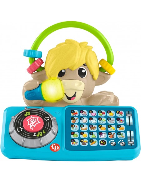 Pulsa los botones de letras de la mesa de mezclas de DJ y gira el disco para activar música divertida, sonidos y frases; el micrófono iluminado se sincroniza con el ritmo