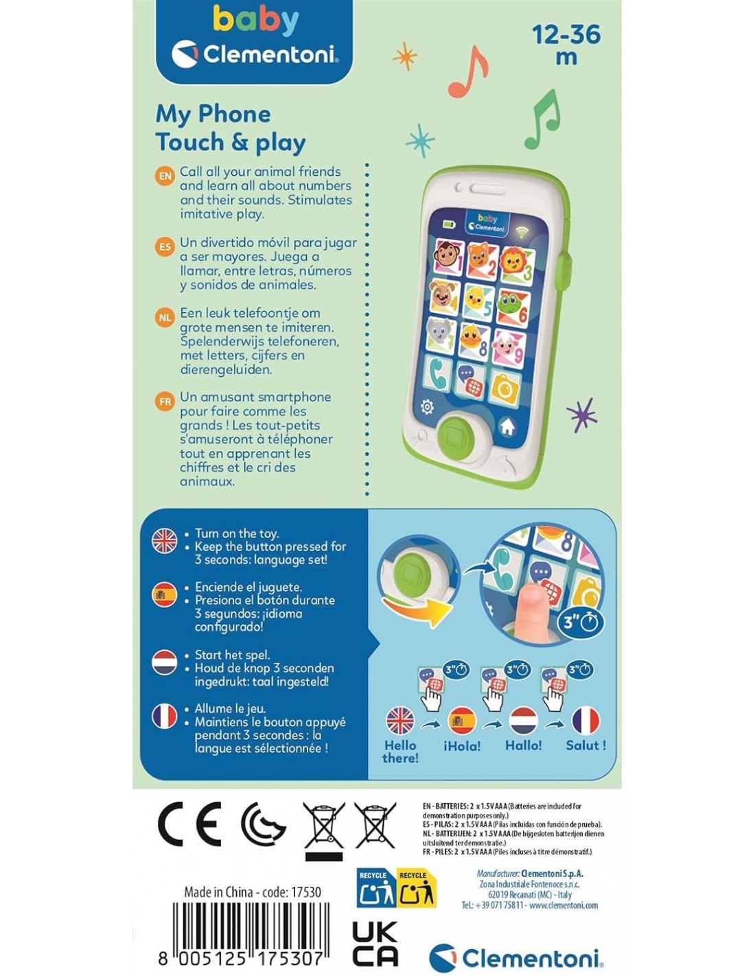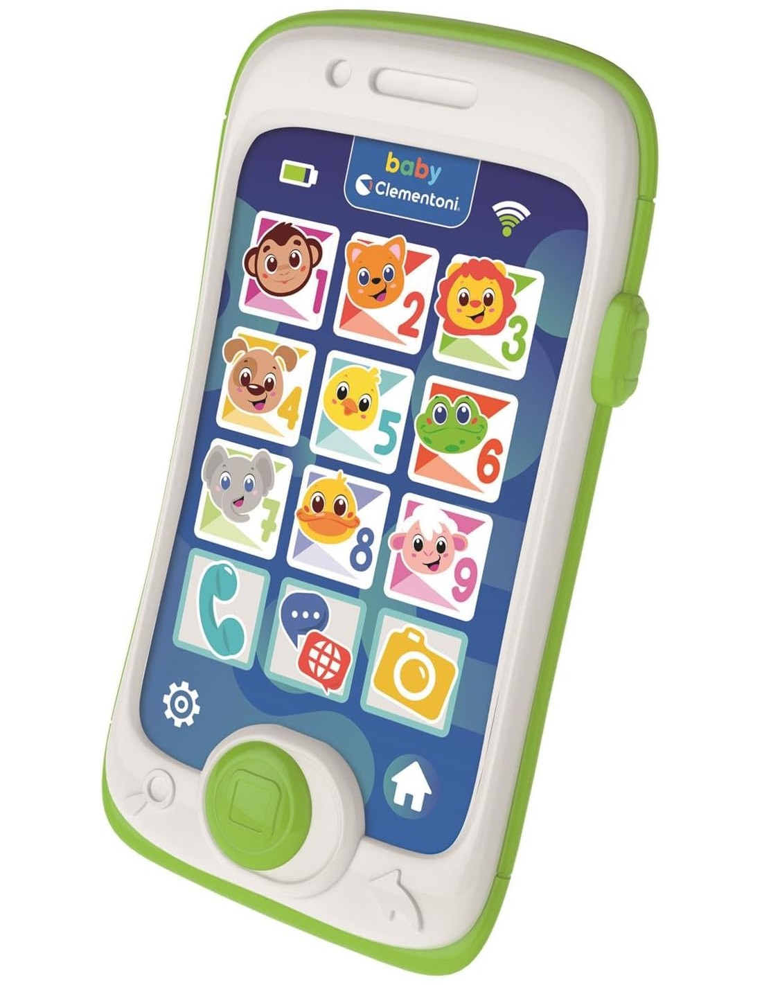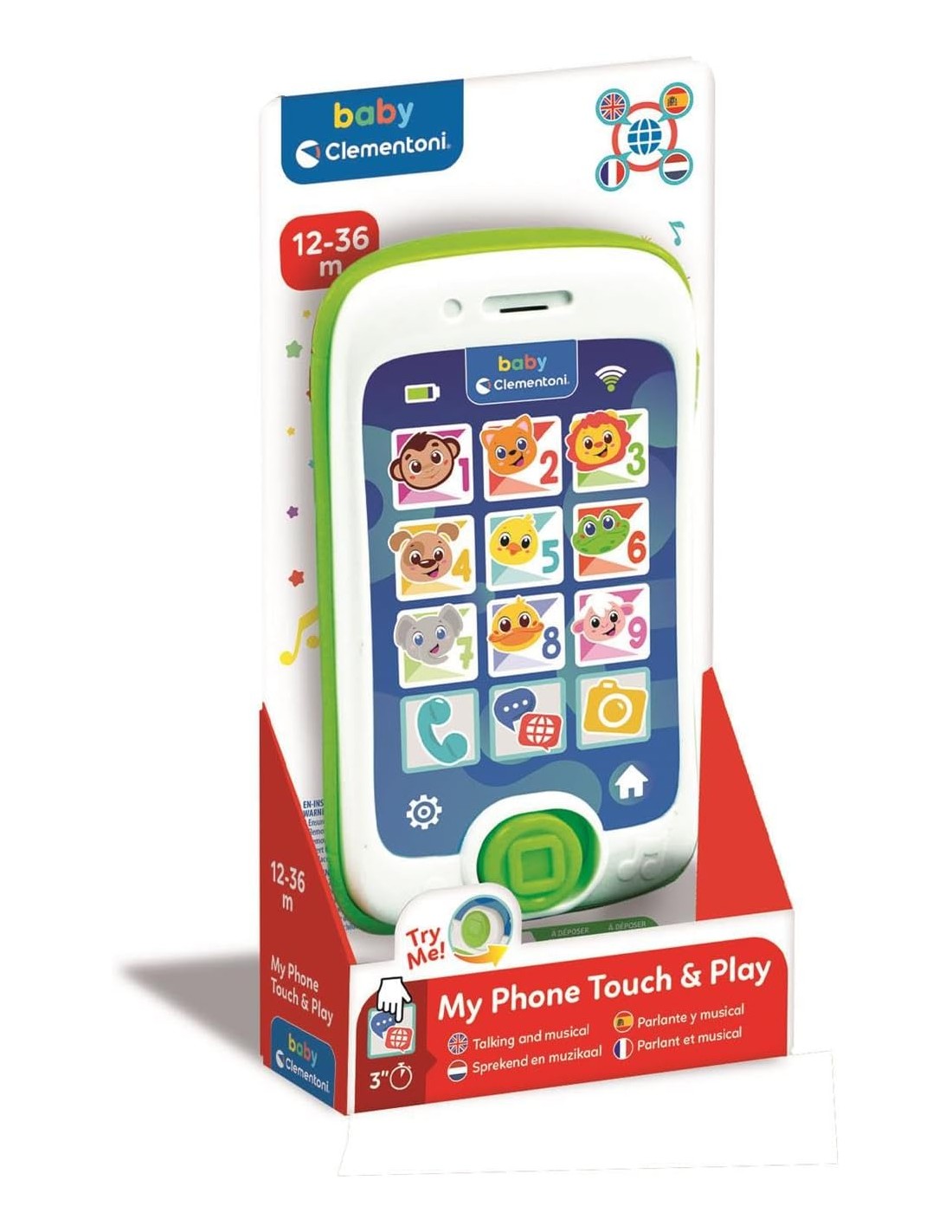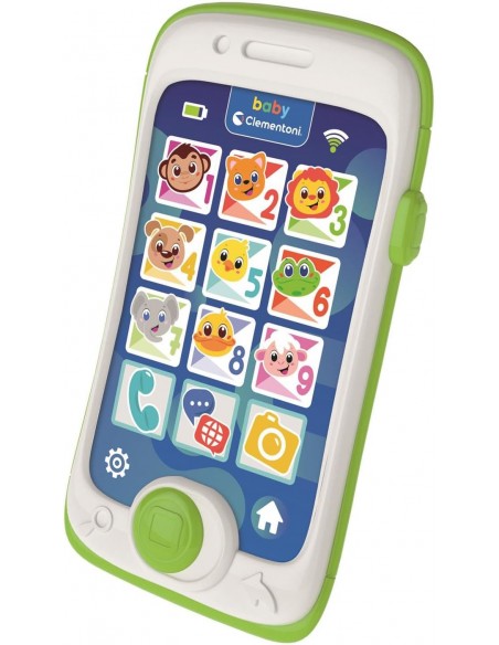 Un smartphone divertido y educativo, para que los niños puedan "teléfono" como mamá y papá. Un verdadero centro de actividades para hablar para aprender sobre animales, gracias a 13 botones grandes y 3 actividades interactivas realmente entretenidas y cautivadoras, con muchas canciones e himnos de guardería