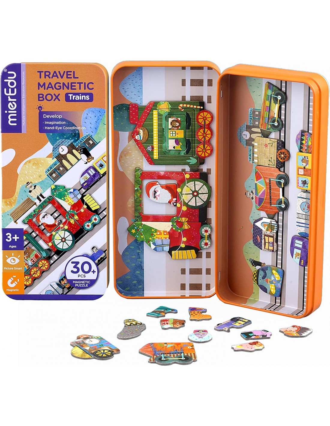 Un gran juego en una pequeña caja. Esta caja de juegos inspirada en los vehículos favoritos de los niños incluye dos escenas y más de 30 piezas. Contiene diferentes trenes formados por piezas magnéticas para ayudar a desarrollar la imaginación, la concentración y la coordinación ojo-mano.