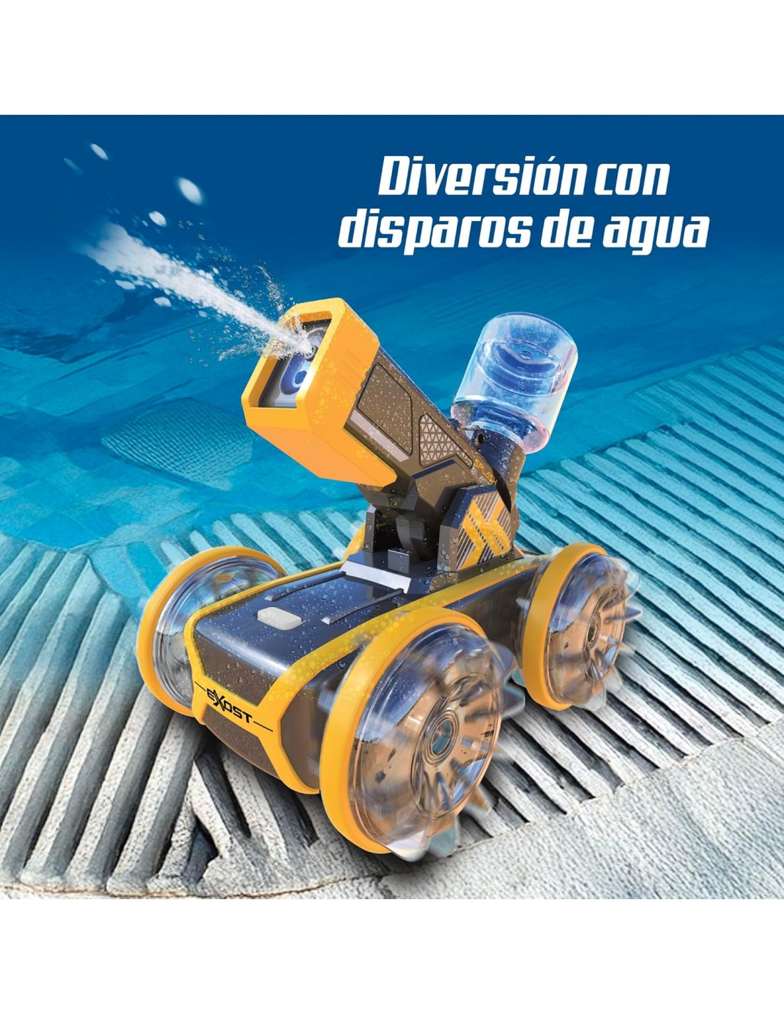 ¡Doble diversión! Conduce y dispara potentes chorros de agua hasta 5 metros, y prepárate para la batalla con el Exost Phyton Blaster