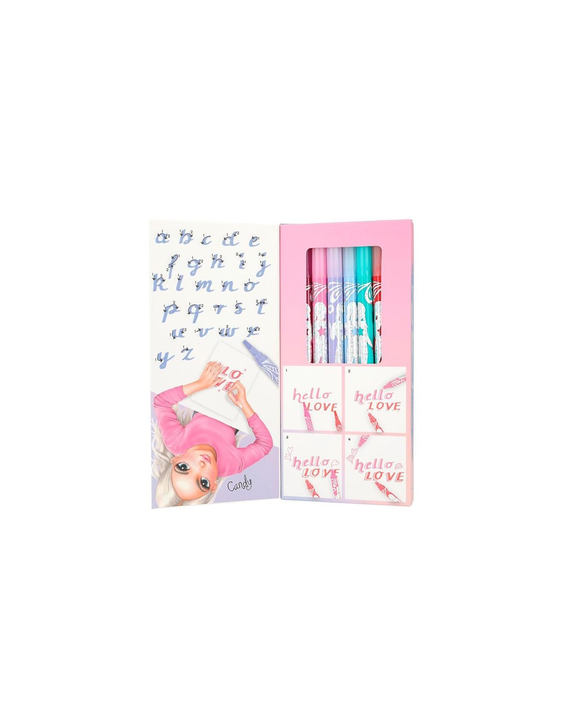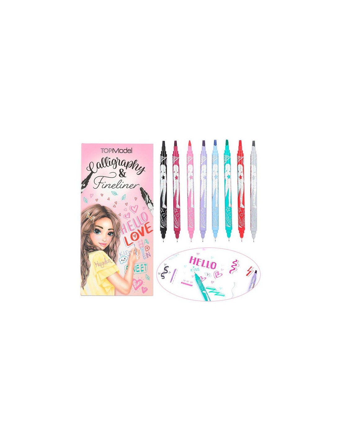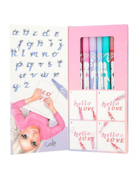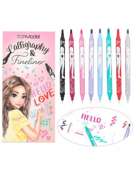 Set de caligrafía TOPModel. Los 8 rotuladores tienen punta recta y plana en un extremo, mientras que el otro extremo es de punta fina. Empaquetados en un estuche de cartón con cierre magnético. Se incluye una breve escuela de hand lettering con consejos extraordinarios.