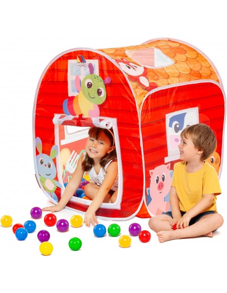 Parque de bolas infantil con forma de casita. El parque se pliega fácilmente para guardarlo en la bolsa que incluye. Se puede usar en interior y exterior. Incluye 25 bolas que se pueden guardar en la bolsa incluida con el parque