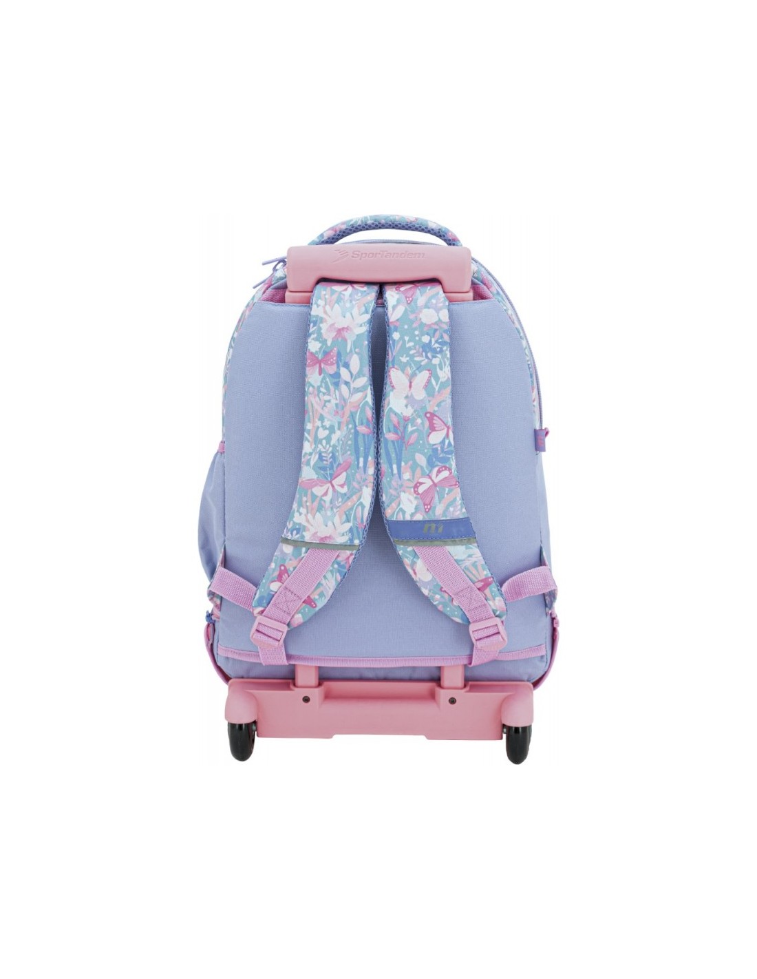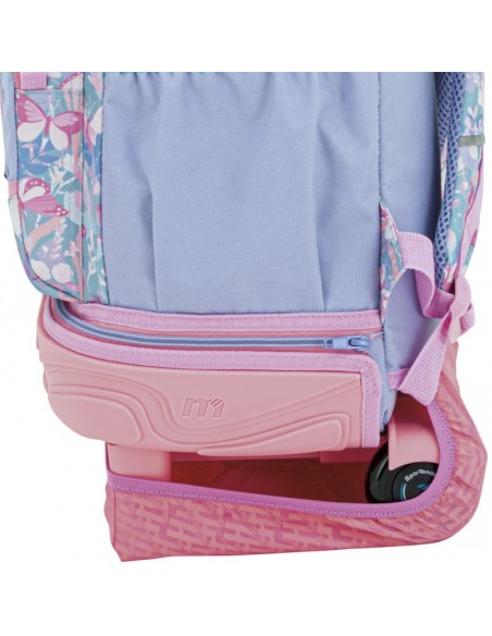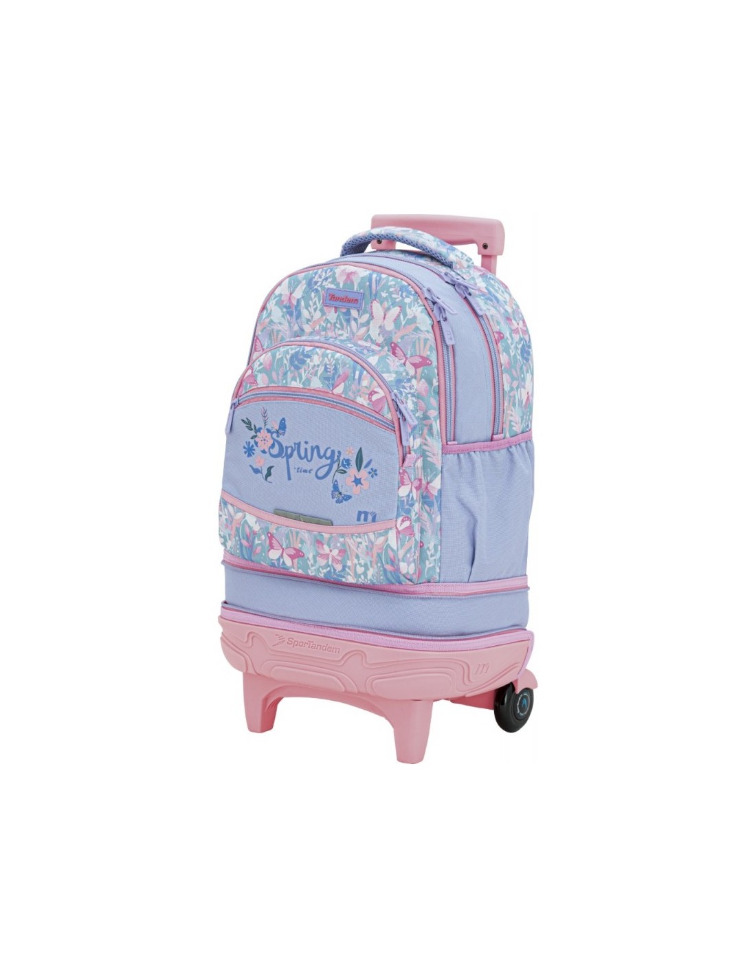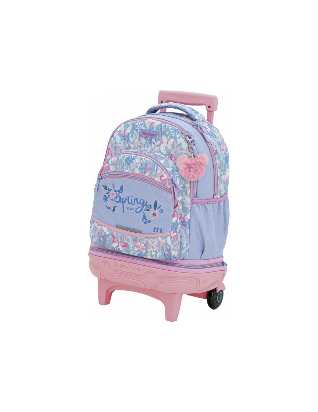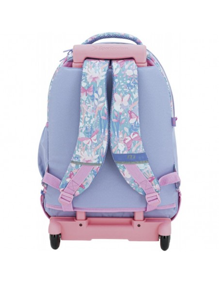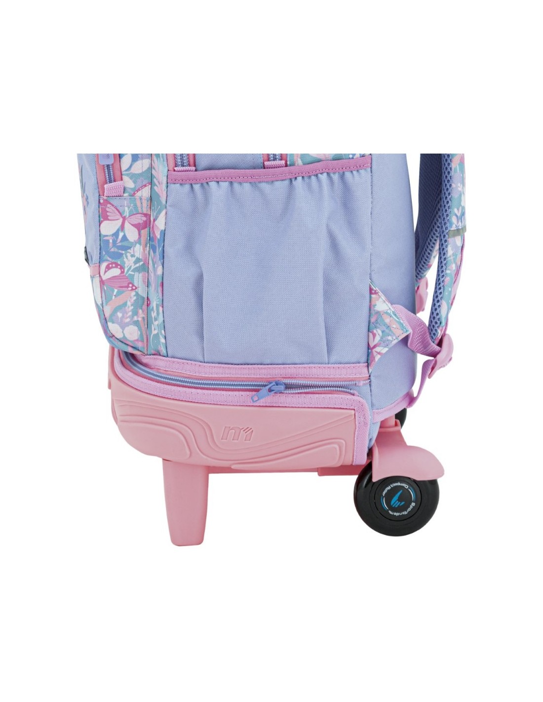 Mochila escolar con carro desmontable. 2 usos en 1: el uso de Carro fijo de base resistente y el otro uso de solo mochila, pues se puede separar del carro a traves de la cremallera que los une. Tiene dos compartimientos amplios y un bolsillo frontal con un organizador interno. Tirantes ergonómicos de espuma transpirable con velcro al final que se adhieren al espaldar para que no se arrastren por el suelo. Bolsillo en el lateral derecha para llevar una botella . Asaacolchada de agarre superior. Cuenta con un forro escondido en la parte posterior de la mochila para cubrir las dos ruedas y así evitar que se ensucie la espalda.