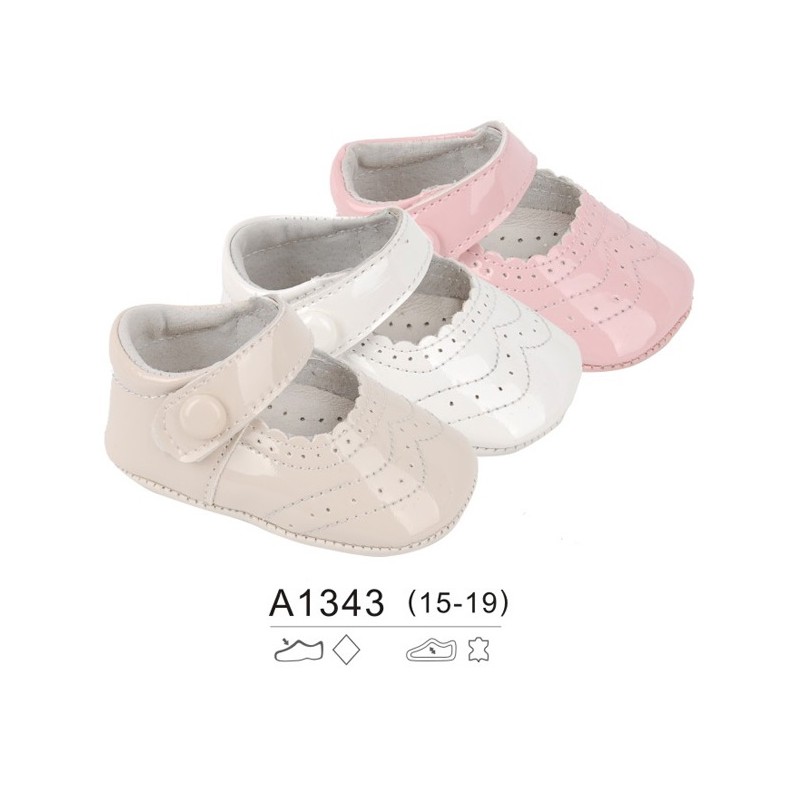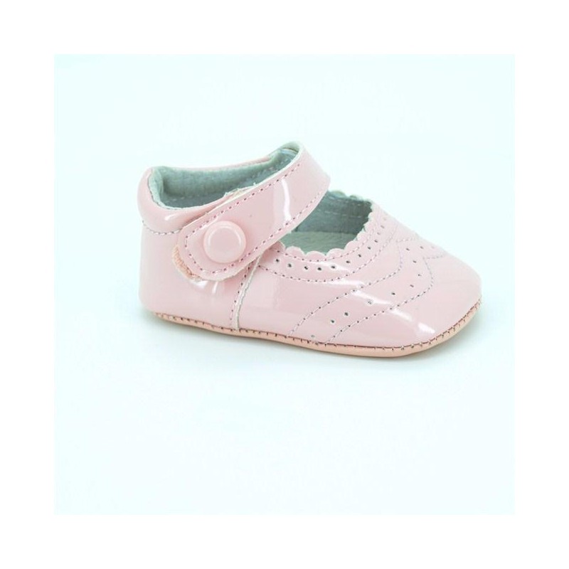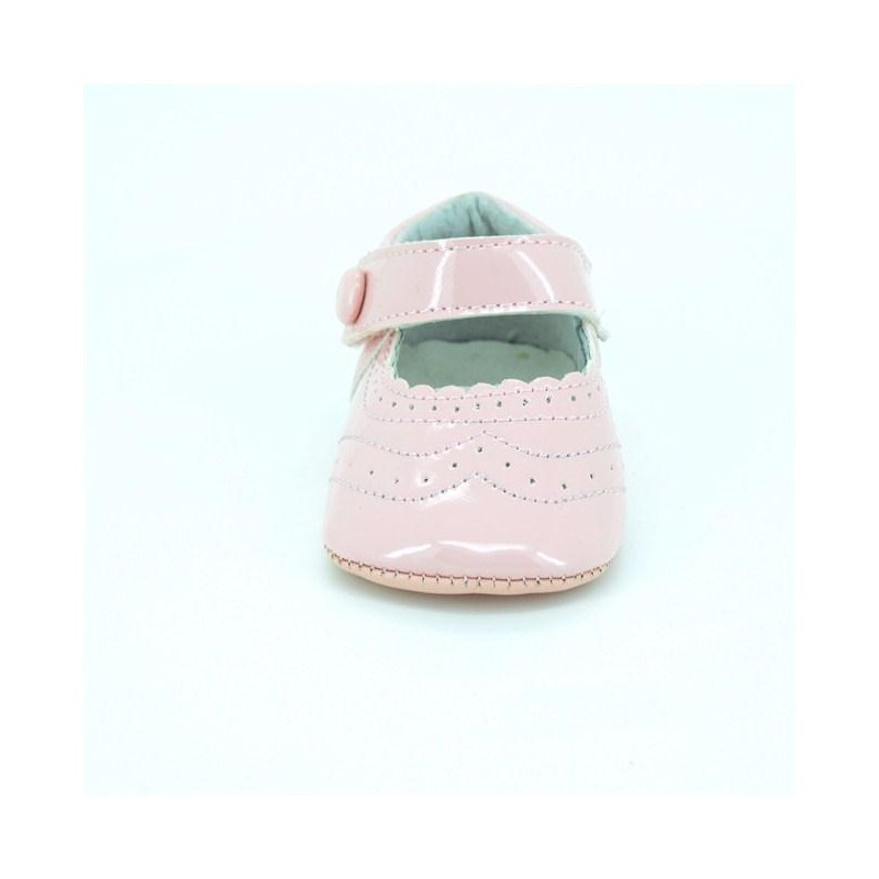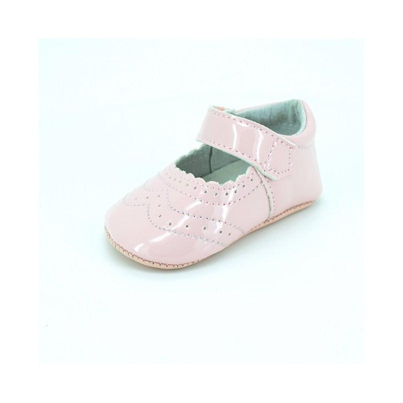 Merceditas para bebés en charol, de estilo inglés sin suela y cierre de velcro para un perfecto ajuste. Contiene la plantilla interior y suela de piel para mayor protección. Están disponible en color blanco, beige y rosa. ¡Preciosas y muy combinables con todo!