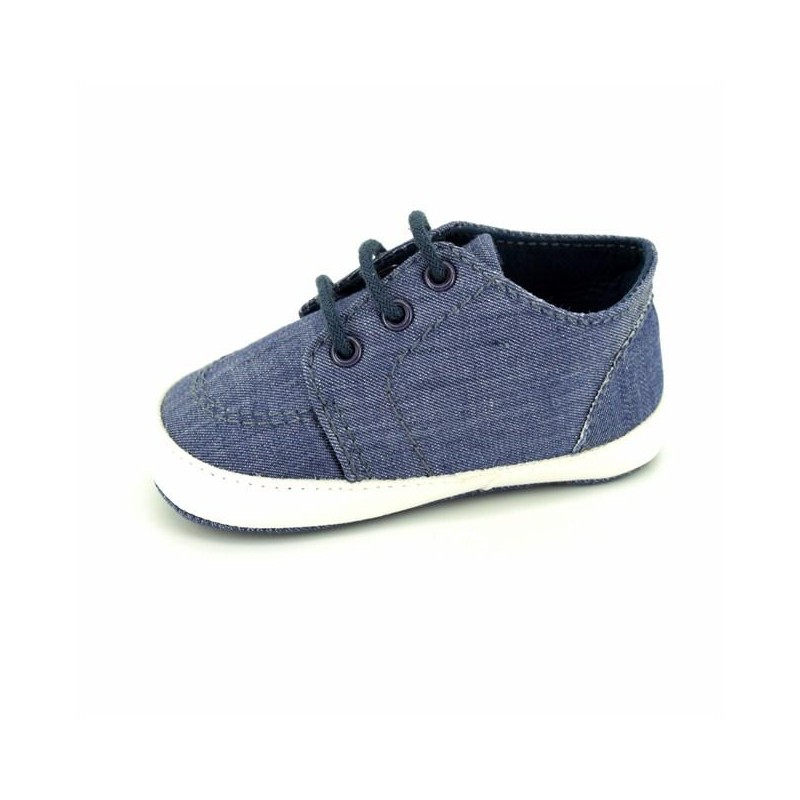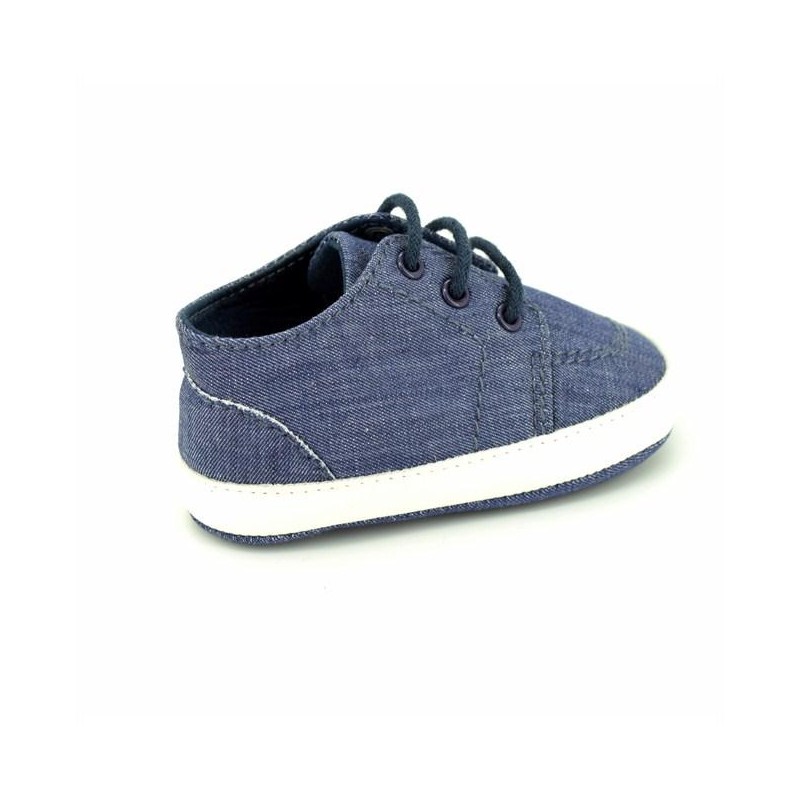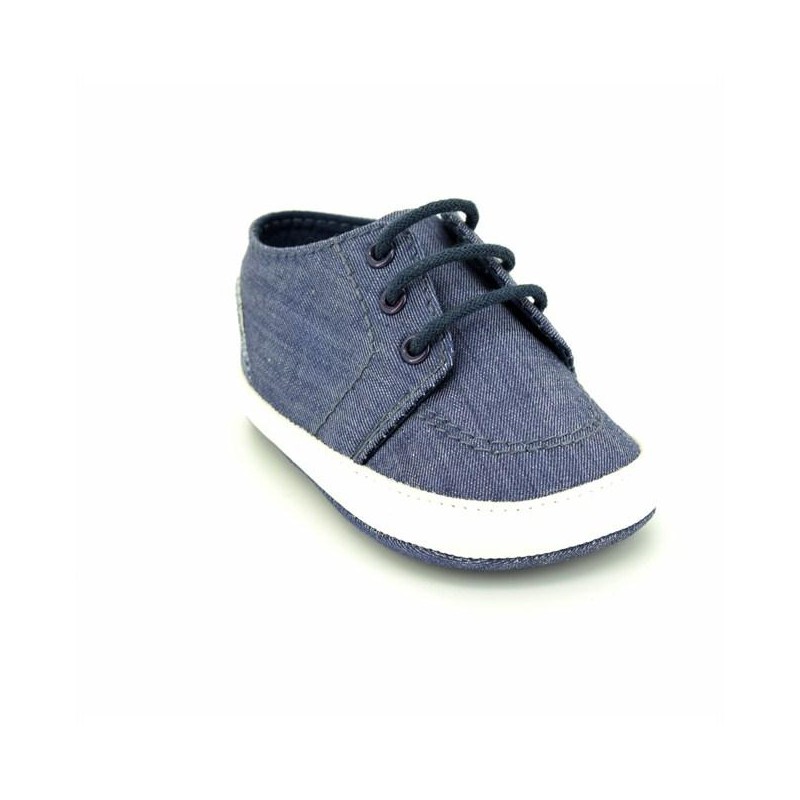Zapatillas de bebé sin suela confeccionadas en textil. Dispone de cierre de cordones para un perfecto ajuste y está disponible en cuatro colores, marino, rojo, taupe y jeans.